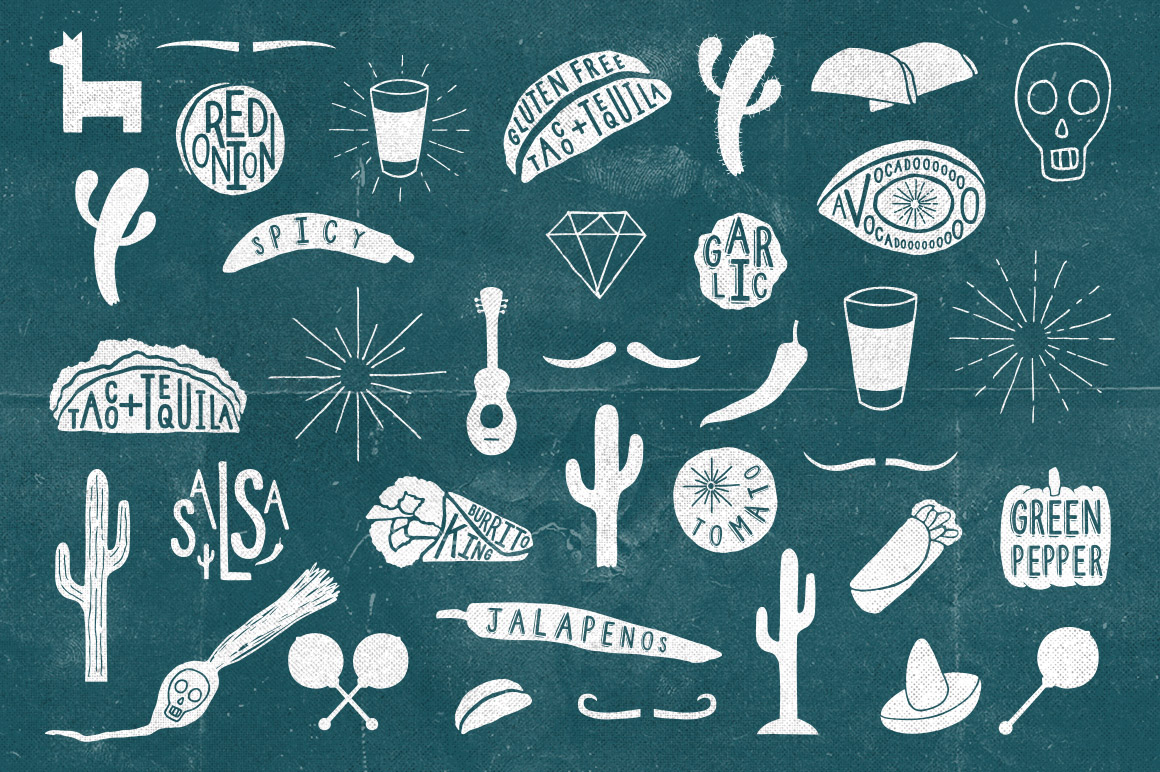 2 Mexican-inspired fonts with hand-drawn icons that really capture the heart of Mexico, or at least what I have gathered is the heart of Mexico from Halloween costumes and Saturday morning cartoons. You get: 2 Mexicana fonts, with and without gluten! 36 Vectors, including cacti, moustaches, tacos and a piñata (Ai CS and high-res PSD).