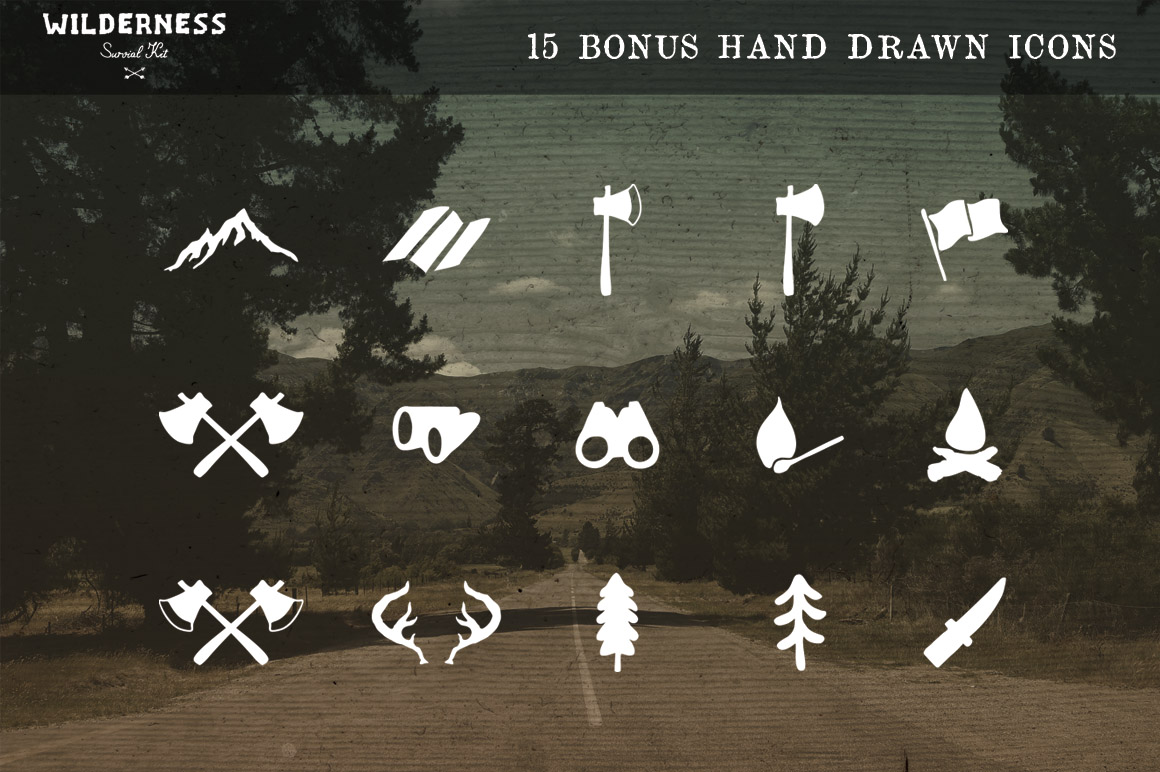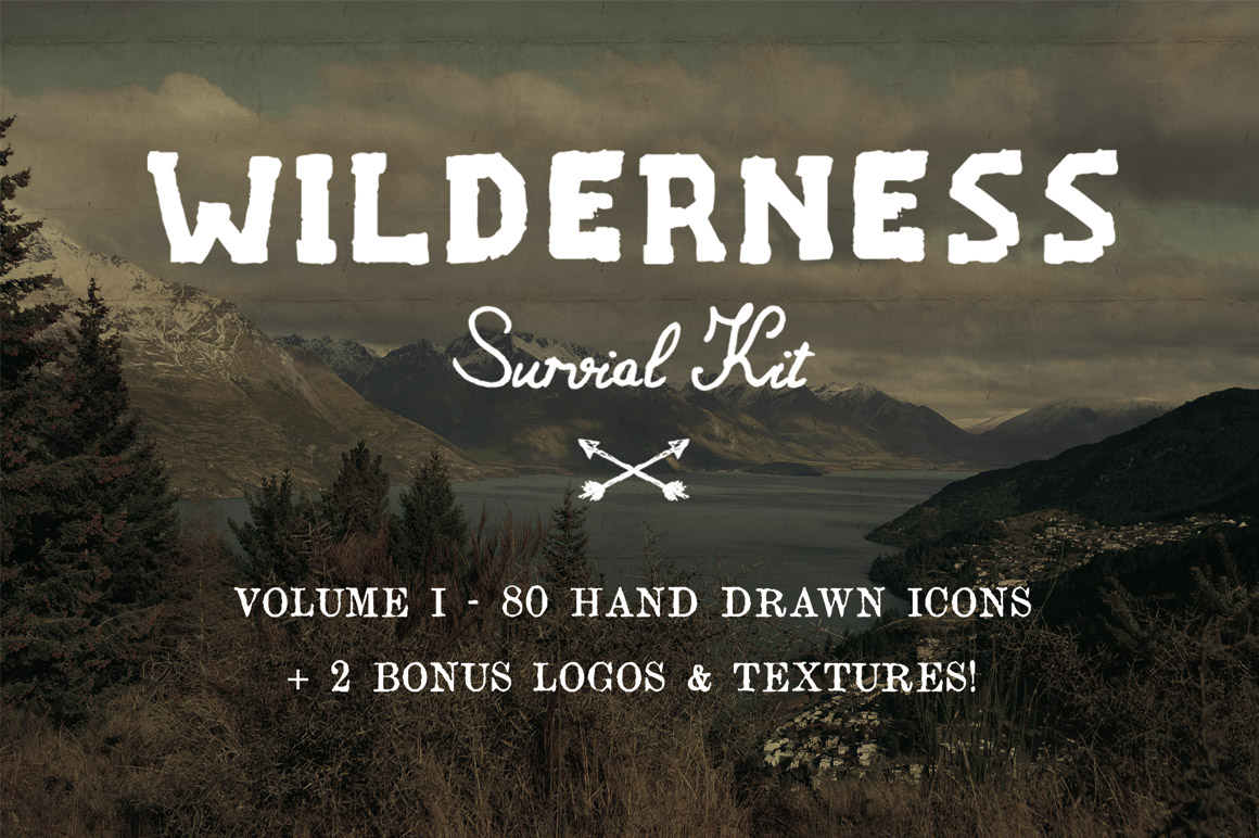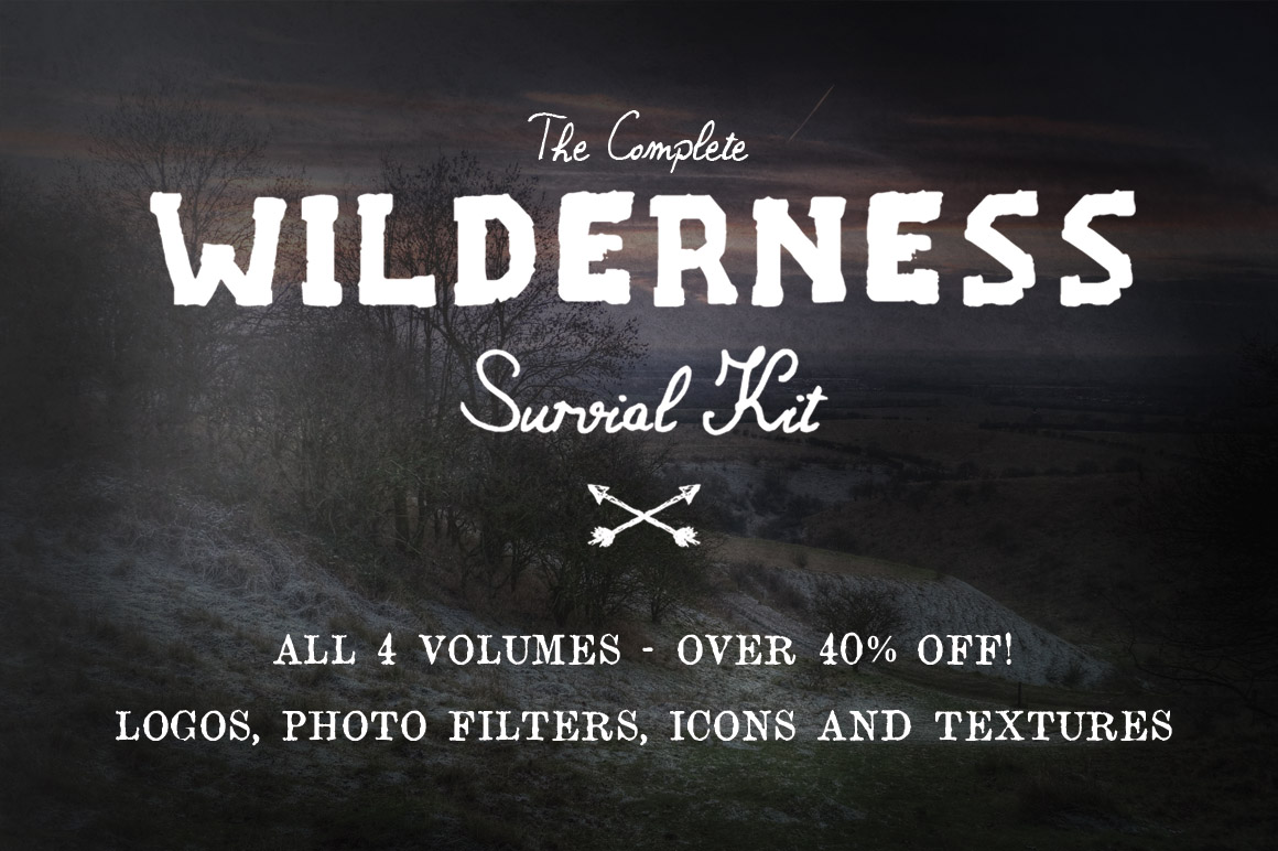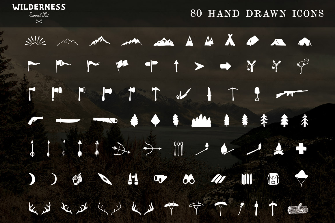 All 4 volumes of The Wilderness Survival Kit. A mega bundle of hand drawn wilderness inspired icons, logo templates, photo filters and textures.