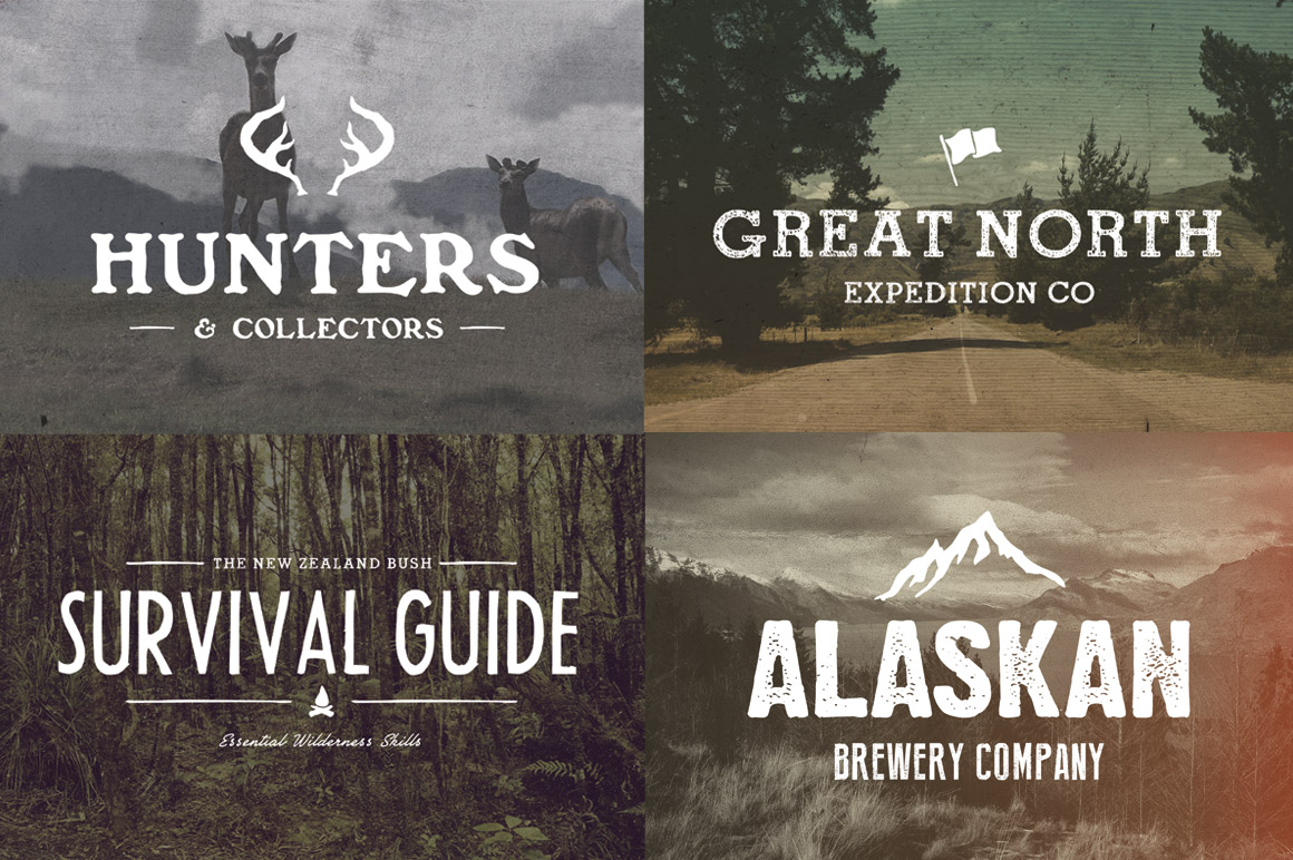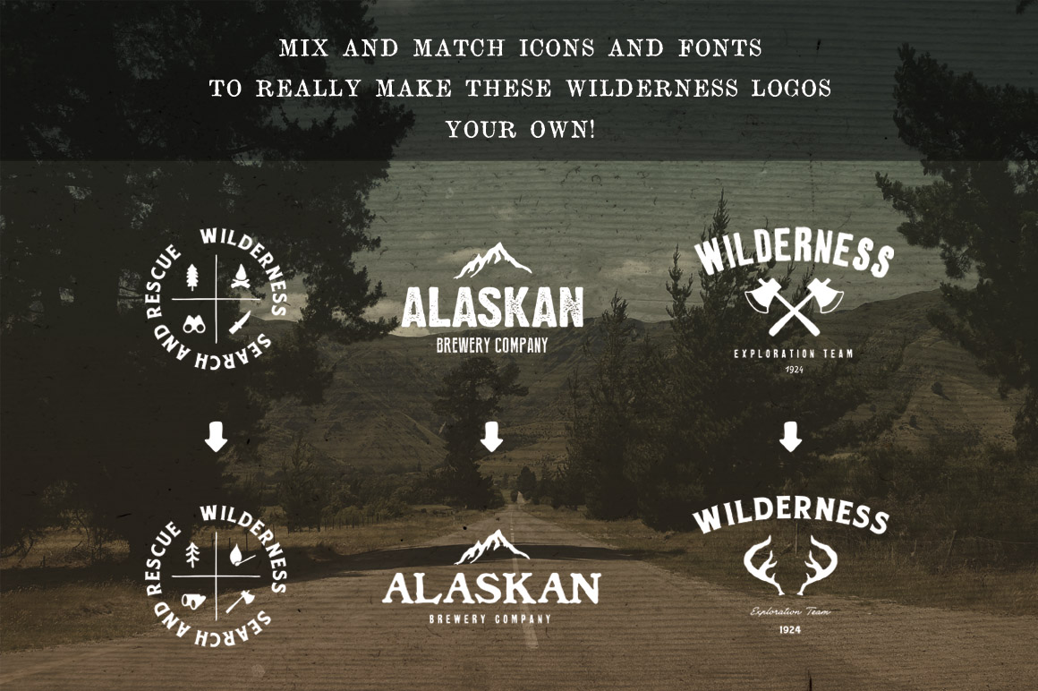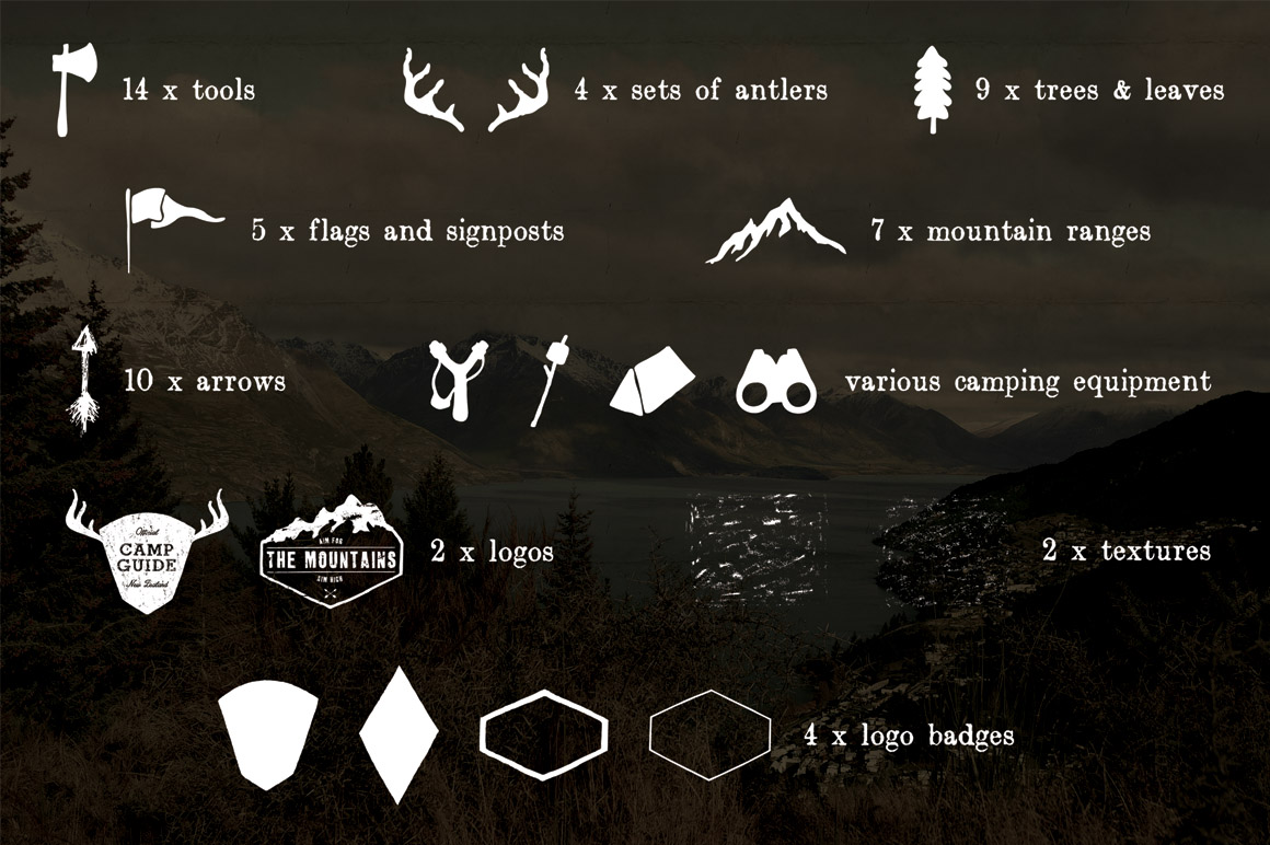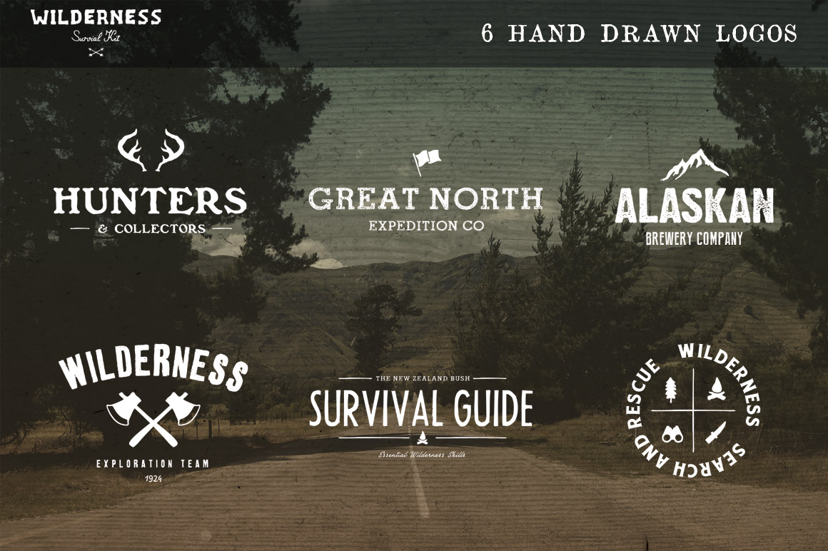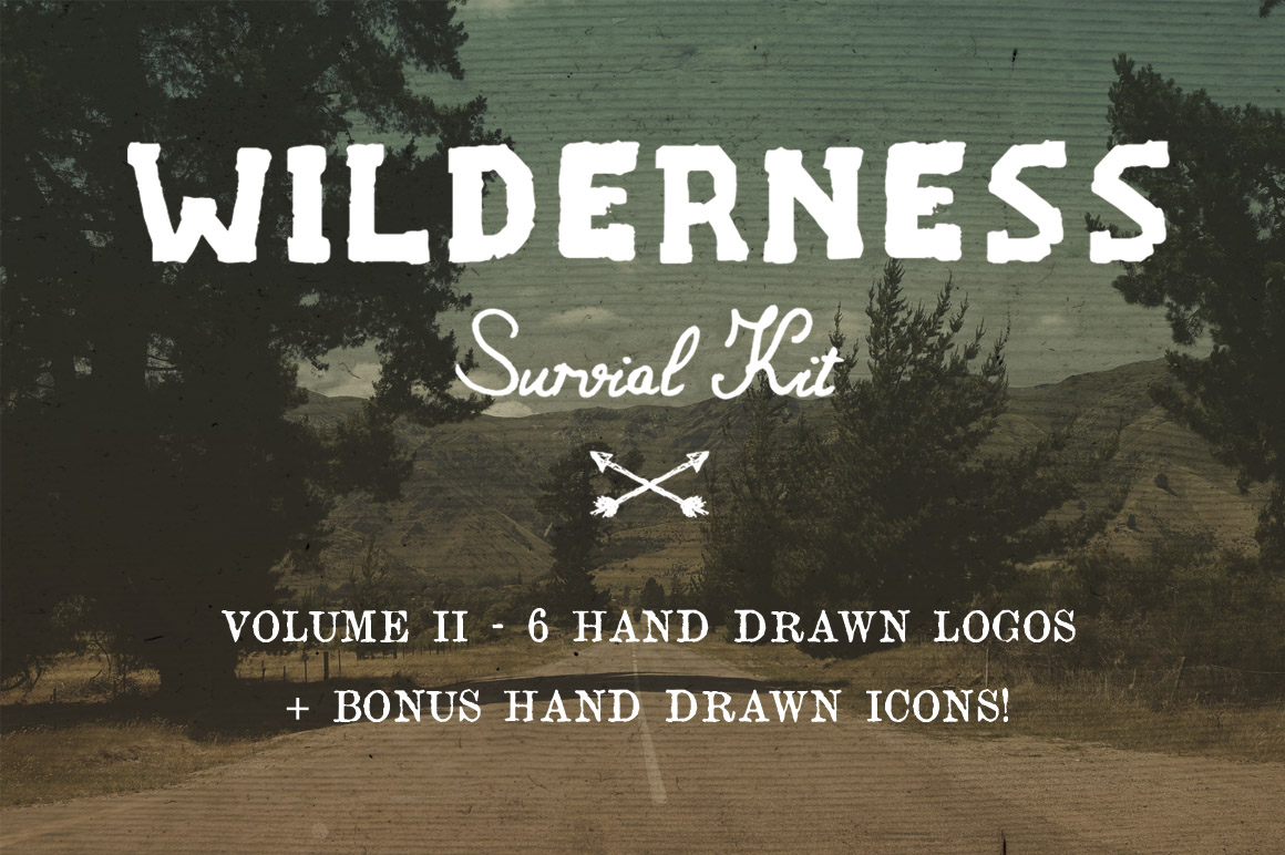 All 4 volumes of The Wilderness Survival Kit. A mega bundle of hand drawn wilderness inspired icons, logo templates, photo filters and textures.
