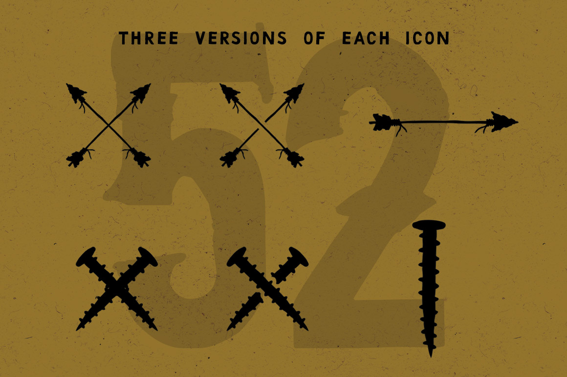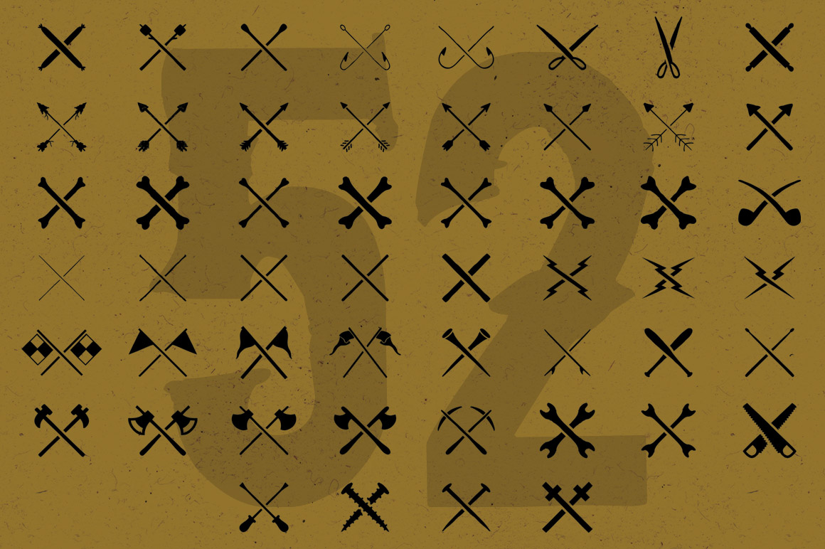 This pack is full of hand drawn icons…52 to be exact. Included are: 8 arrows, 7 crossbones, 3 lightning bolts, 4 flags, 11 tools +more…like a marshmallow on a stick. Each icon comes in 3 variations; individual and 2x crossbones (1x solid and 1x cut away). Ai and PSD format.