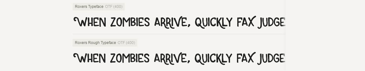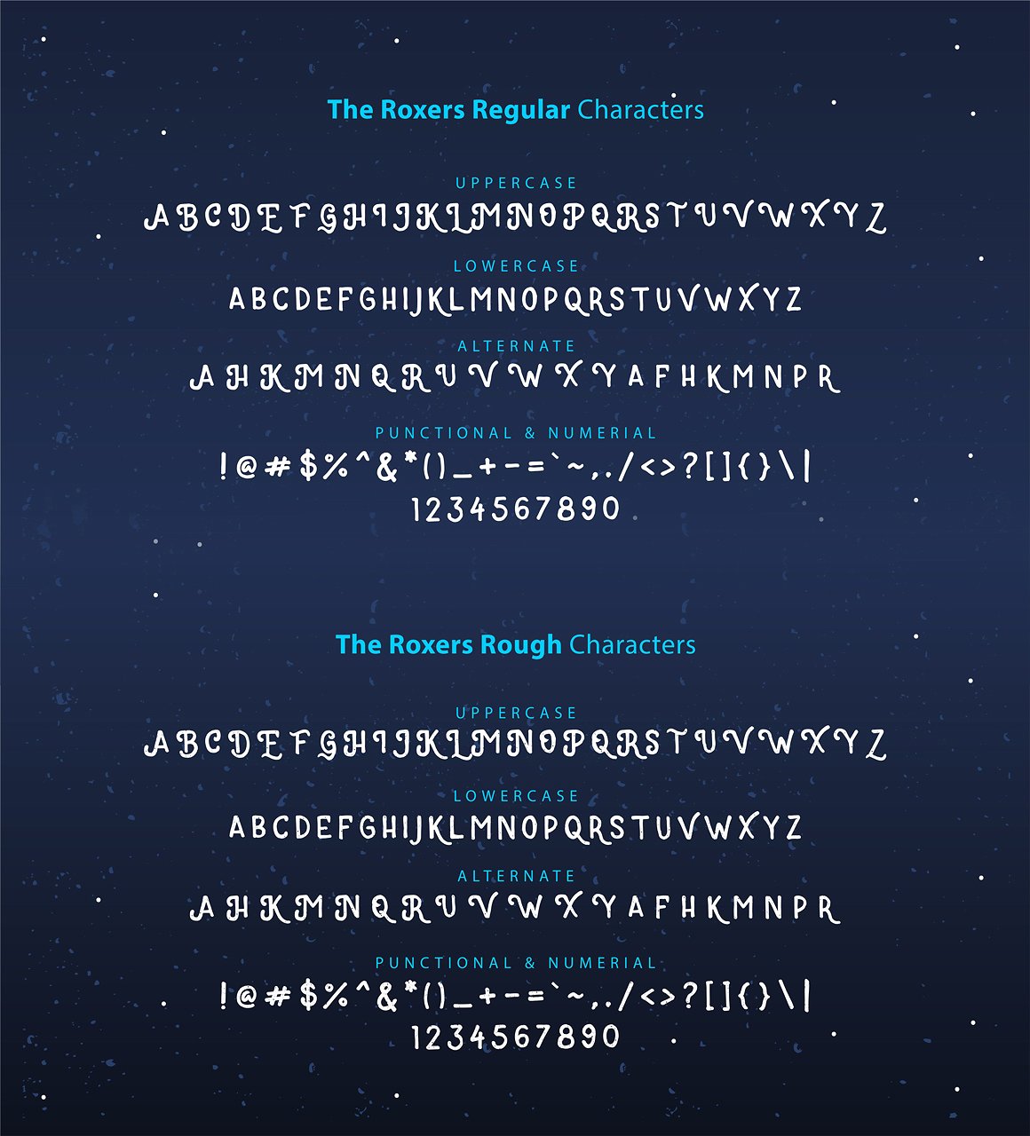 The Roxers Typeface is a new handmade display font from our type studio, this font intended to use in retro and vintage design styles. The Roxers suitable for any design needs as vintage and retro looks like, Such as vintage invitation design, branding, logotype design, advertising, invitation, art quote, book cover, wedding invitation, special events, birthday, custom mug, pillow, t-shirts, any lettering needs and more. The Roxers Typeface available in two style, regular and rough.