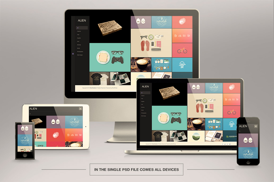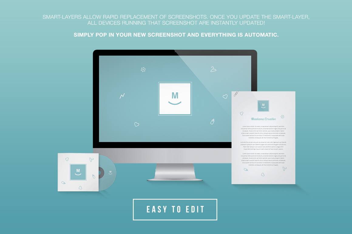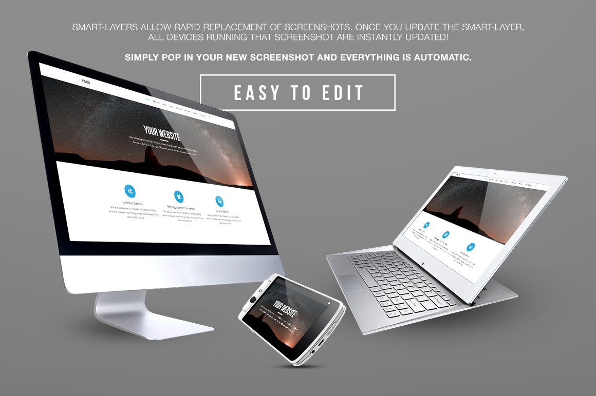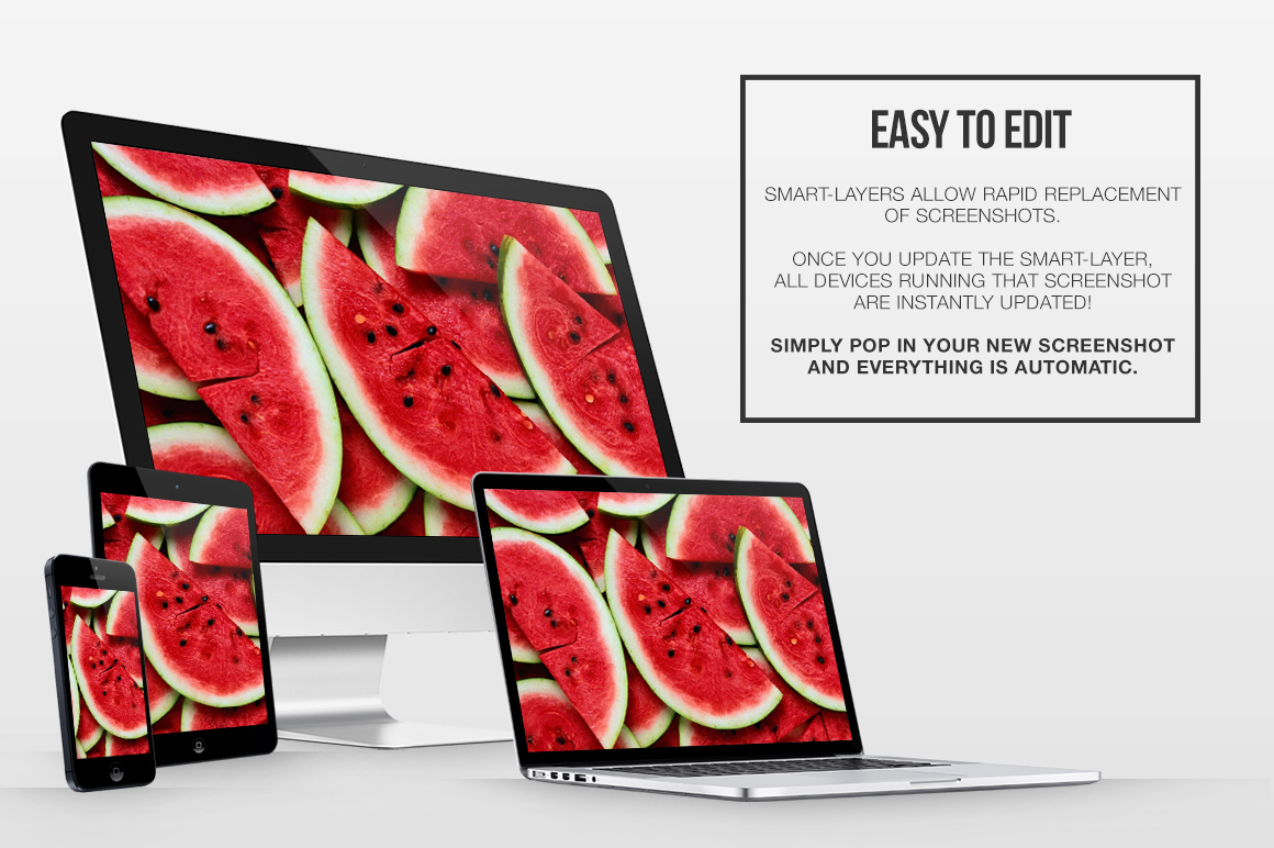 This Simple & Responsive Branding Mockup allows you to quickly display your designs and layouts into a digital device showcase. Smart-layers allow rapid replacement of screenshots. Once you update the smart-layer, all devices running that screenshot are instantly updated! Video Tutorial Here: http://youtu.be/qeOiaRirjko