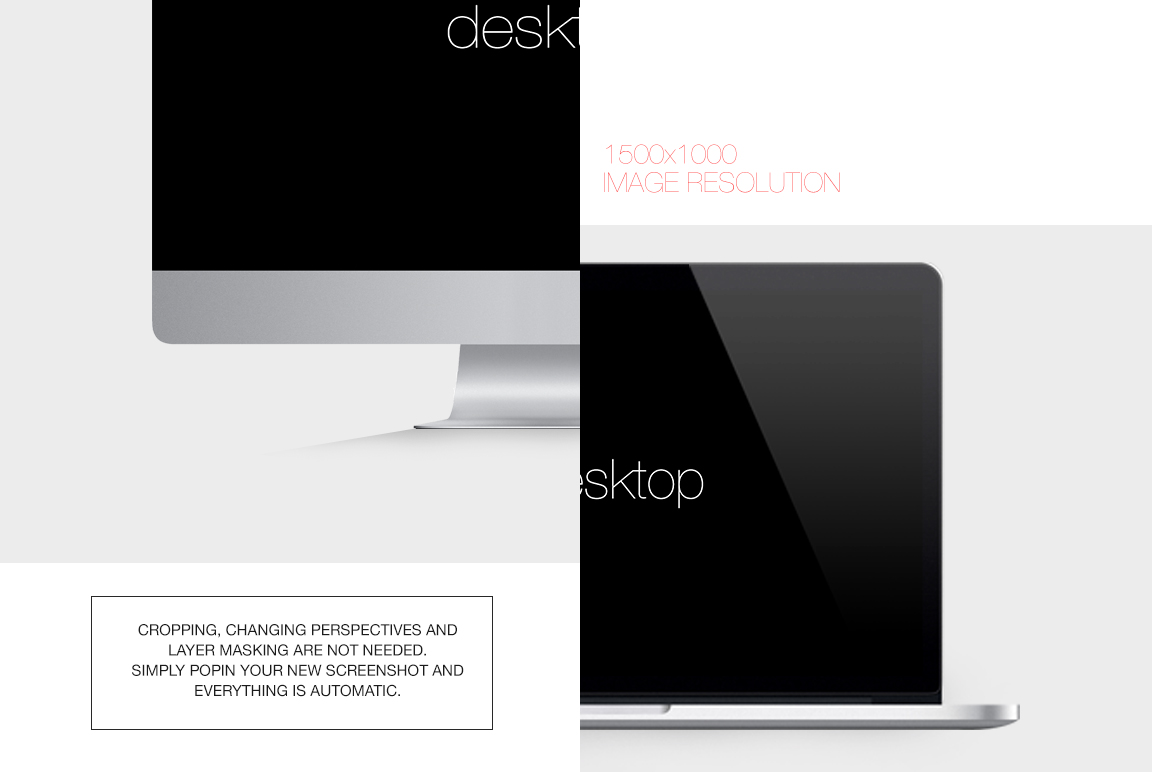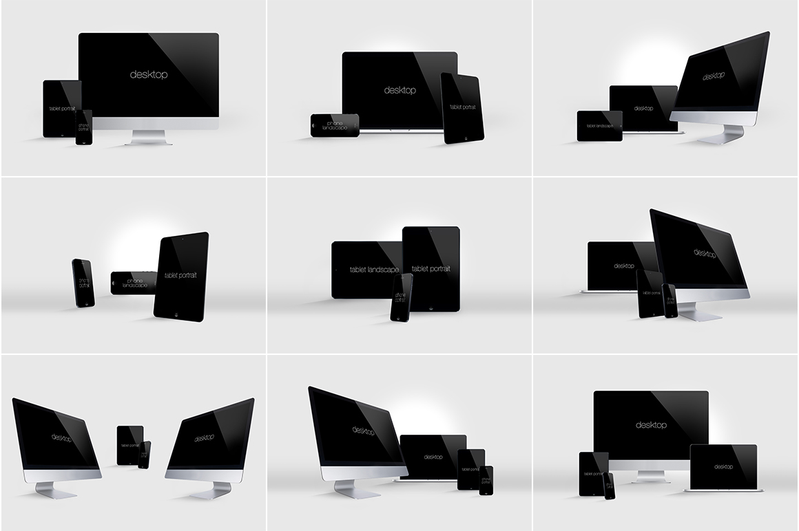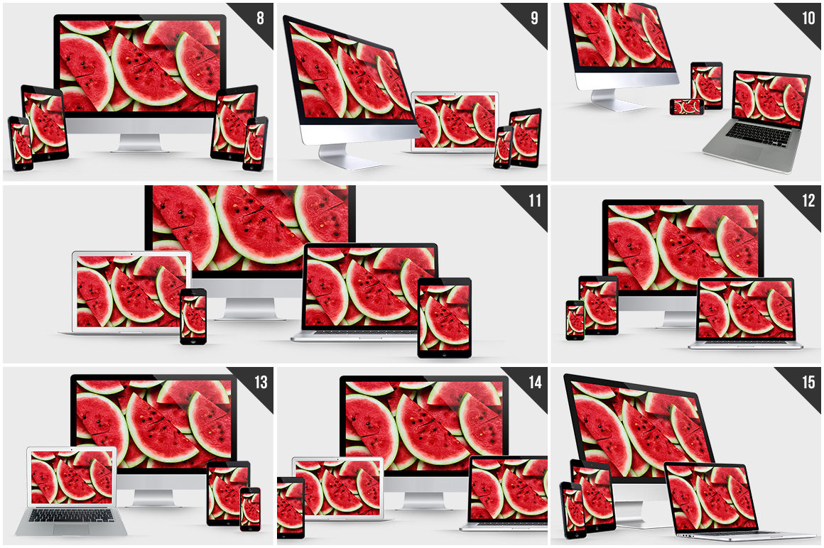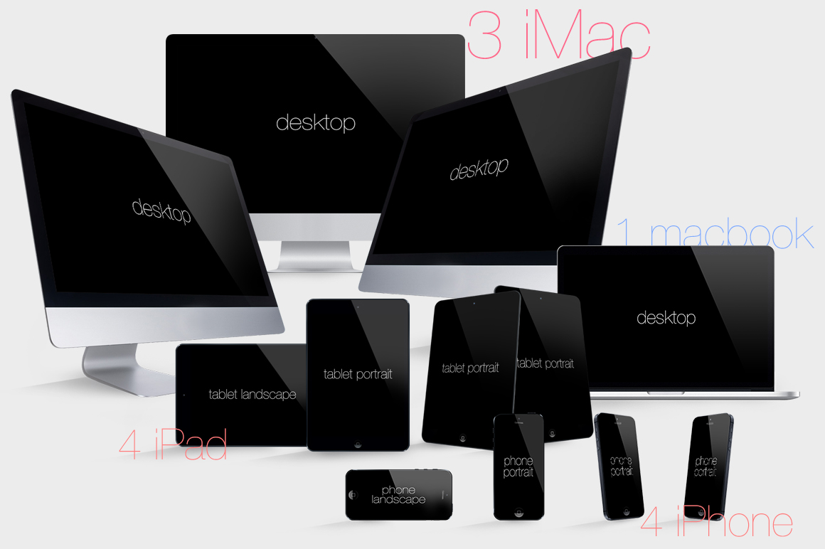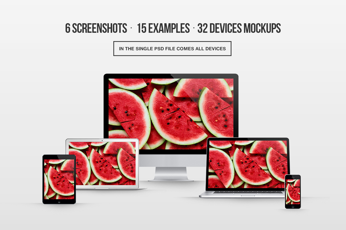 This Display Screen Mockup Pack allows you to quickly display your designs and layouts into a digital device showcase. Smart-layers allow rapid replacement of screenshots. Once you update the smart-layer, all devices running that screenshot are instantly updated! This pack contains 12 devices, 4x iPad, 4x iPhone 5, 3x Apple iMac and 1x Macbook. In the single PSD file comes all original devices, along with 10 made examples. Cropping, changing perspectives and layer masking are not needed. Simply pop in your new screenshot and everything is automatic.