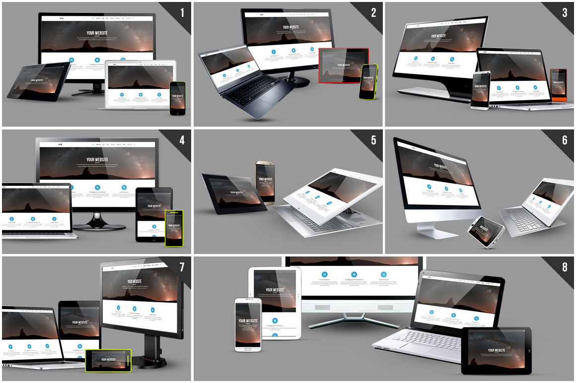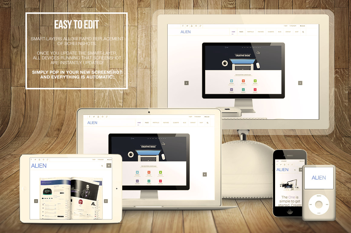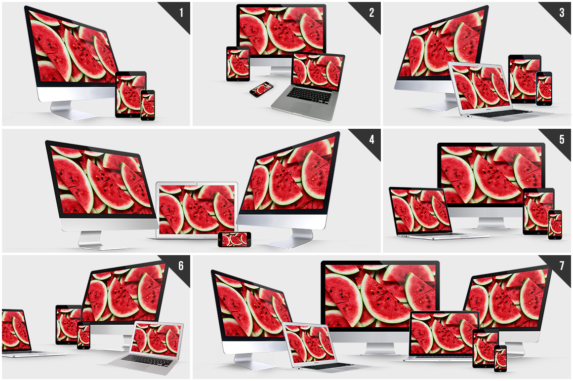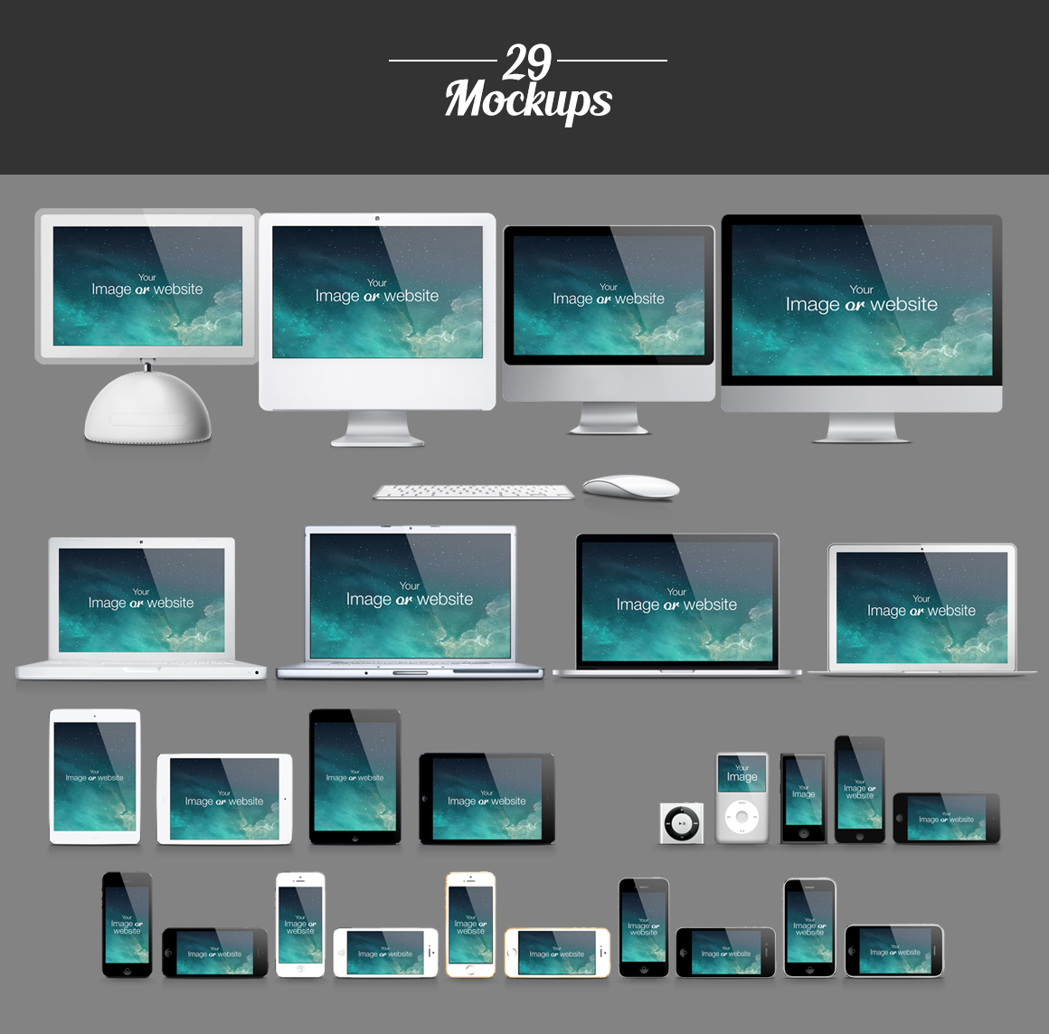 This Apple Device Website Mockup Pack allows you to quickly display your designs and layouts into a digital device showcase. Smart-layers allow rapid replacement of screenshots. Once you update the smart-layer, all devices running that screenshot are instantly updated! Video Tutorial: http://youtu.be/oXl3NT9A8F4?t=1s