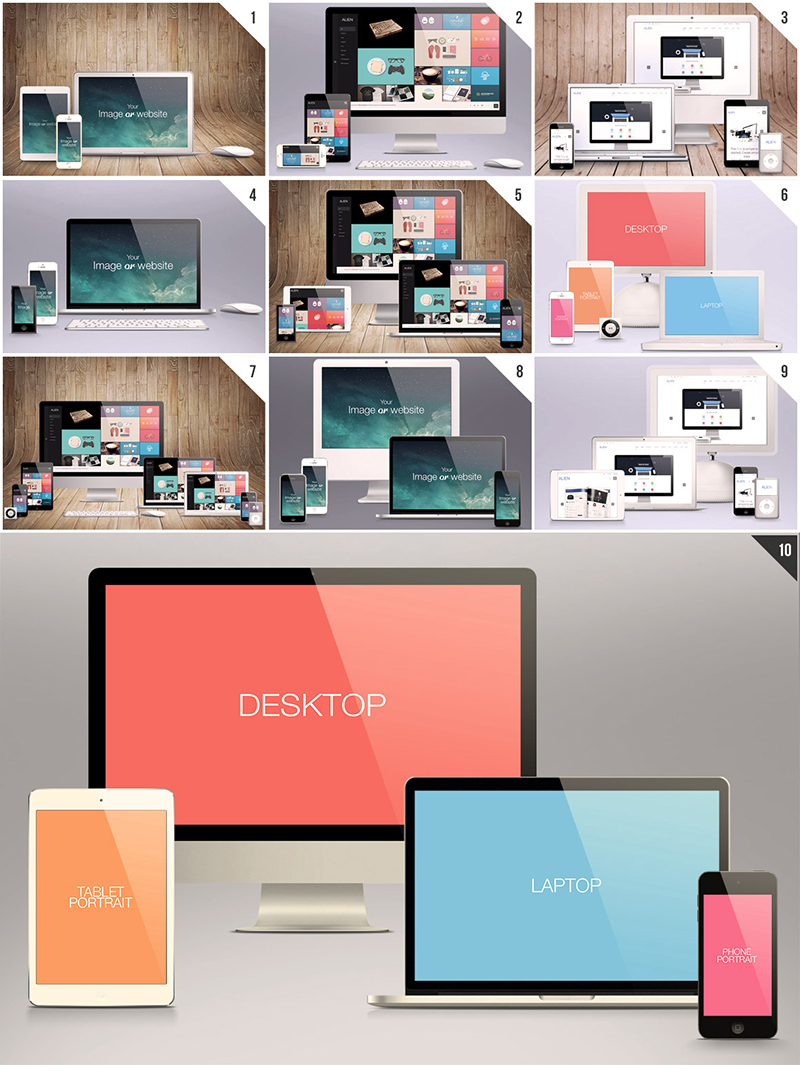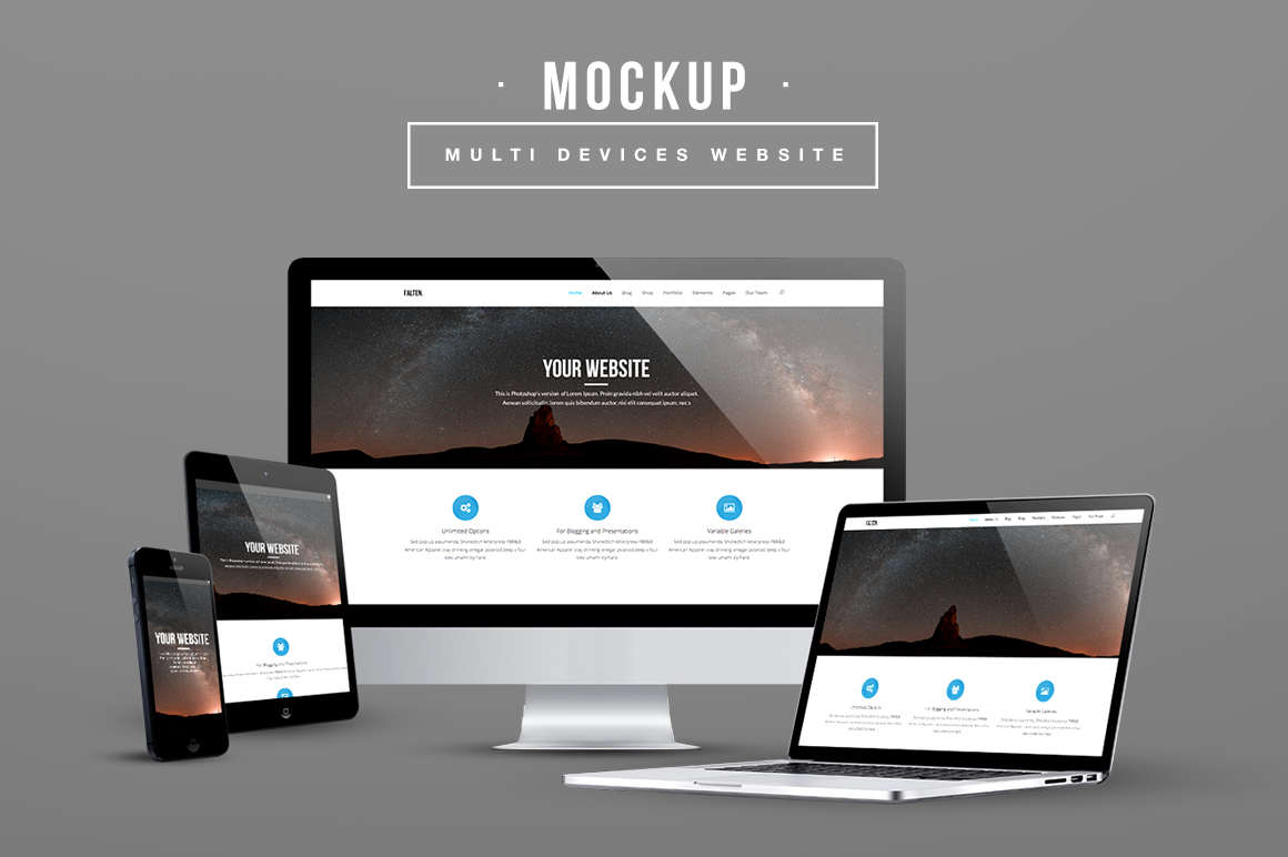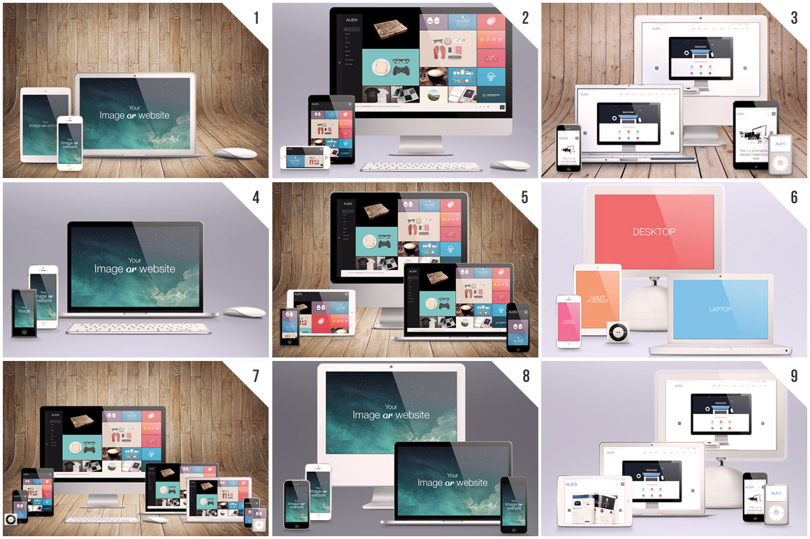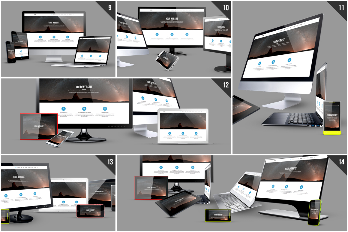 This Apple Device Website Mockup Pack allows you to quickly display your designs and layouts into a digital device showcase. Smart-layers allow rapid replacement of screenshots. Once you update the smart-layer, all devices running that screenshot are instantly updated! Video Tutorial: http://youtu.be/oXl3NT9A8F4?t=1s