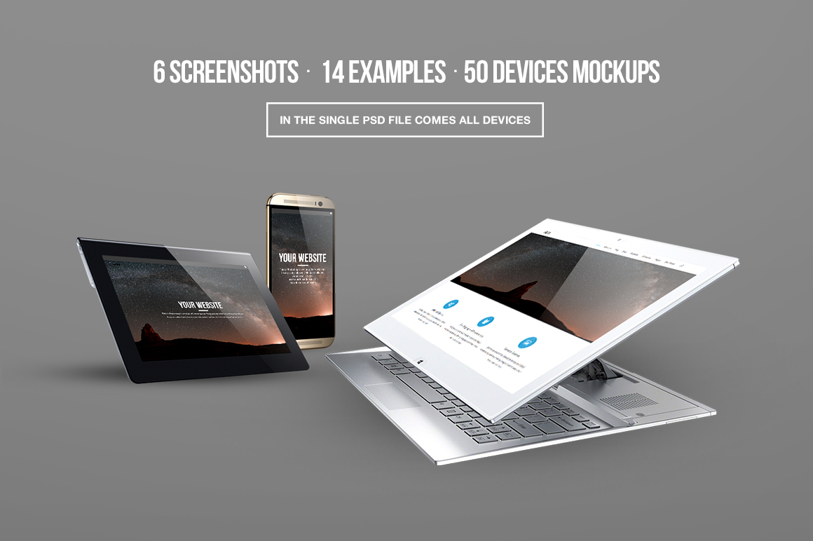 This Multi Devices Website Mockups allows you to quickly display your designs and layouts into a digital device showcase. Smart-layers allow rapid replacement of screenshots. Once you update the smart-layer, all devices running that screenshot are instantly updated! This pack contains 51 devices. In the single PSD file comes all original devices, along with 14 made examples