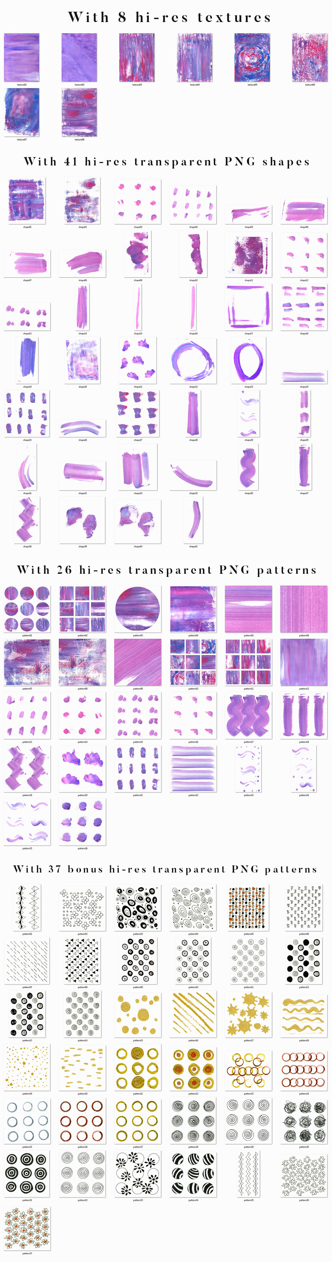 8 Hi-res textures, 41 transparent PNG shapes & 63 transparent PNG patterns