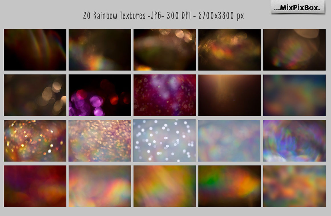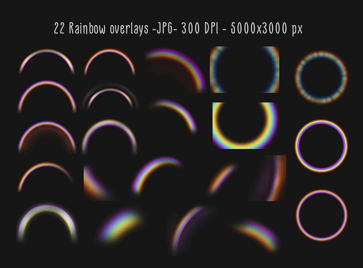 - 22 Rainbow overlays in JPEG format – high resolution 5000x3000px – 300dpi
