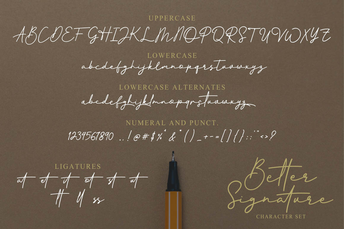 Better Signature is a signature font that you can use to make a design for logo branding, poster headline, magazines, book titles, business cards, beautiful fashion designs, advertisements, product designs, wedding invitation, signature or handwritten quote.