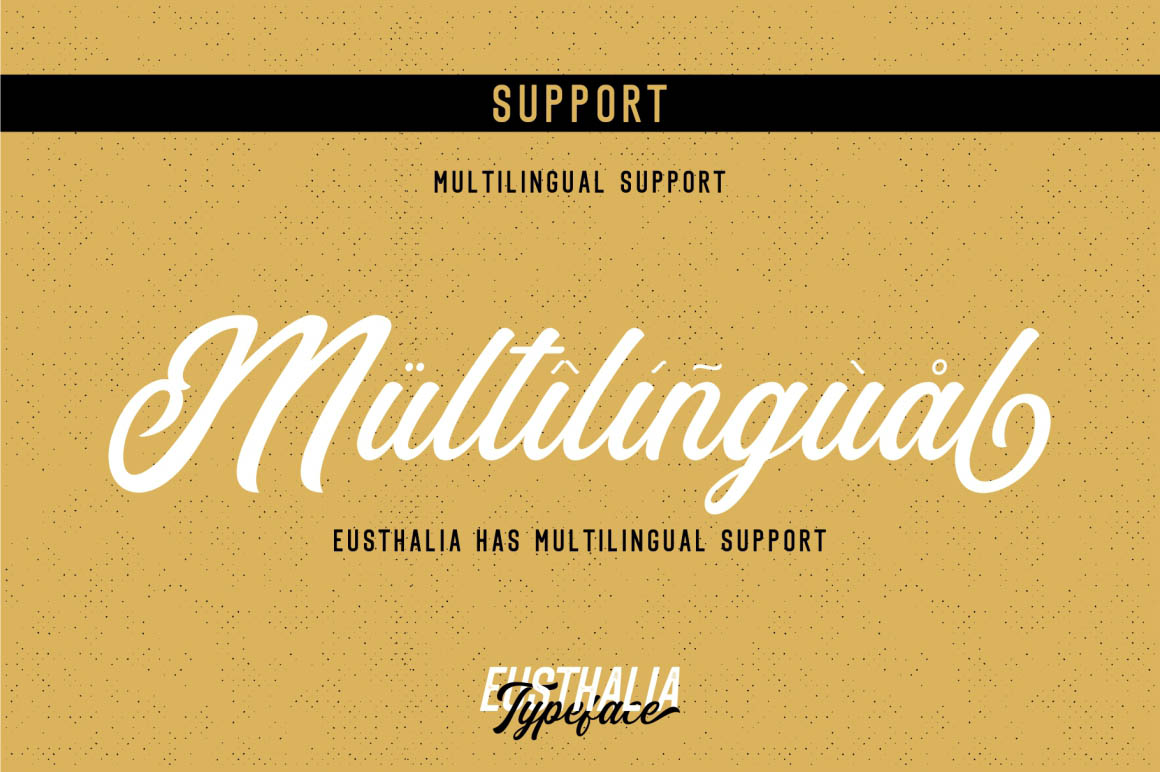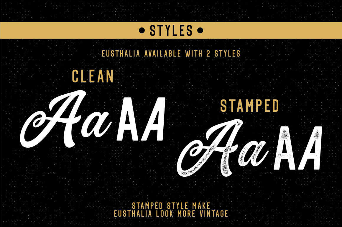 Eusthalia Typeface comes with Sans version (Eusthalia Typeface Family). Eusthalia Typeface is a font which has two styles, Clean and Stamped. With those kind of styles, Eusthalia Typeface can be use in vintage designs. Eusthalia Typeface also has a standart Multilingual Support (Script version). Eusthalia Typeface is great for Logotype, Branding Design, Logo Design, Digital Lettering Arts, T-Shirt/Apparel, Poster, Magazine, Signs, Advertising Design, and any vintage design needs.
