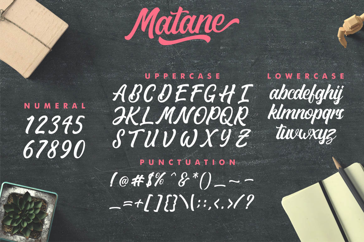 Matane Typeface is great for Apparel Brand, Logo Design, Lettering, Product Packaging, Printed Quotes, Invitations, Image overlays, Greeting cards, Text Headers, Book Cover, Painting design style, and other design project. Mix and match the alternate characters to add an attractive message to your design.