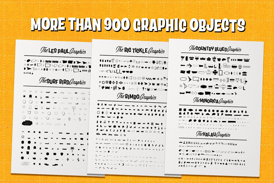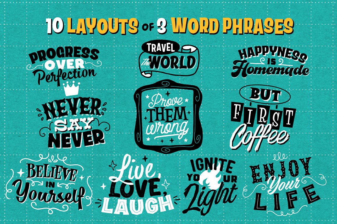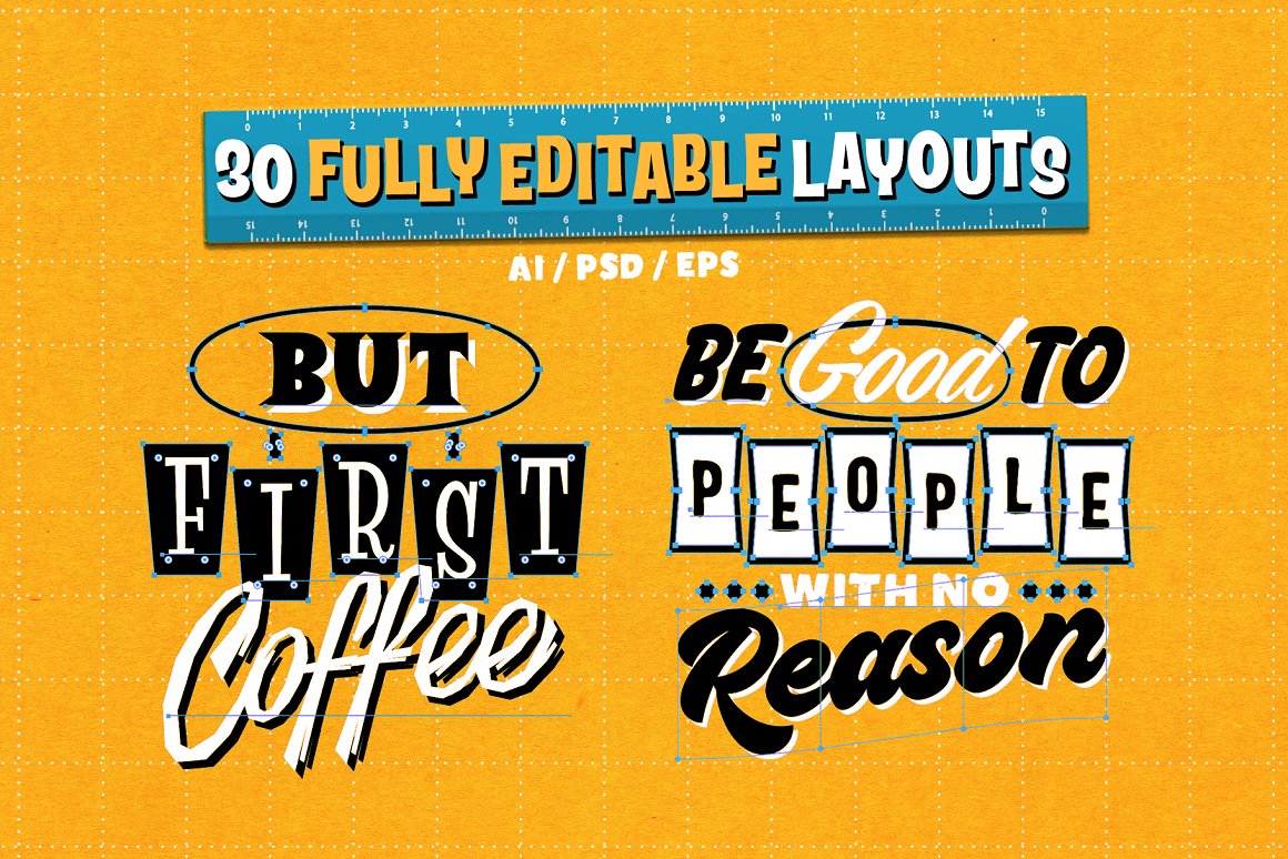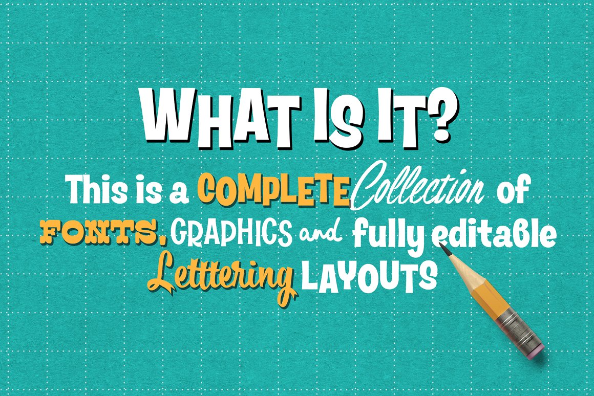 - 180+ fonts, 900+ graphic elemenets & 30 pre-made fully editable lettering layouts!