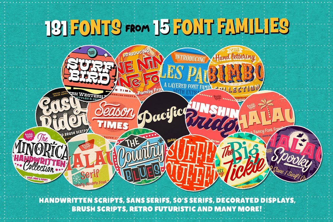 Custom Lettering Typeface Collection from Vintage Voyage contains 180+ fonts, 900+ graphic elemenets & 30 pre-made fully editable lettering layouts!