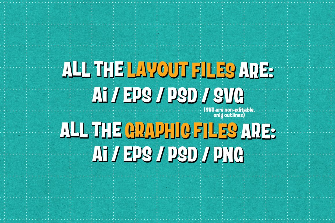 - LAYOUTS: All the layouts are fully editable and have a several formats: Ai / EPS / PSD. All the texts are editable. You may change them or just use them as it. There are also the SVG layout files but with no editable options, only outlines for those who want to use them in Cricut Design space.