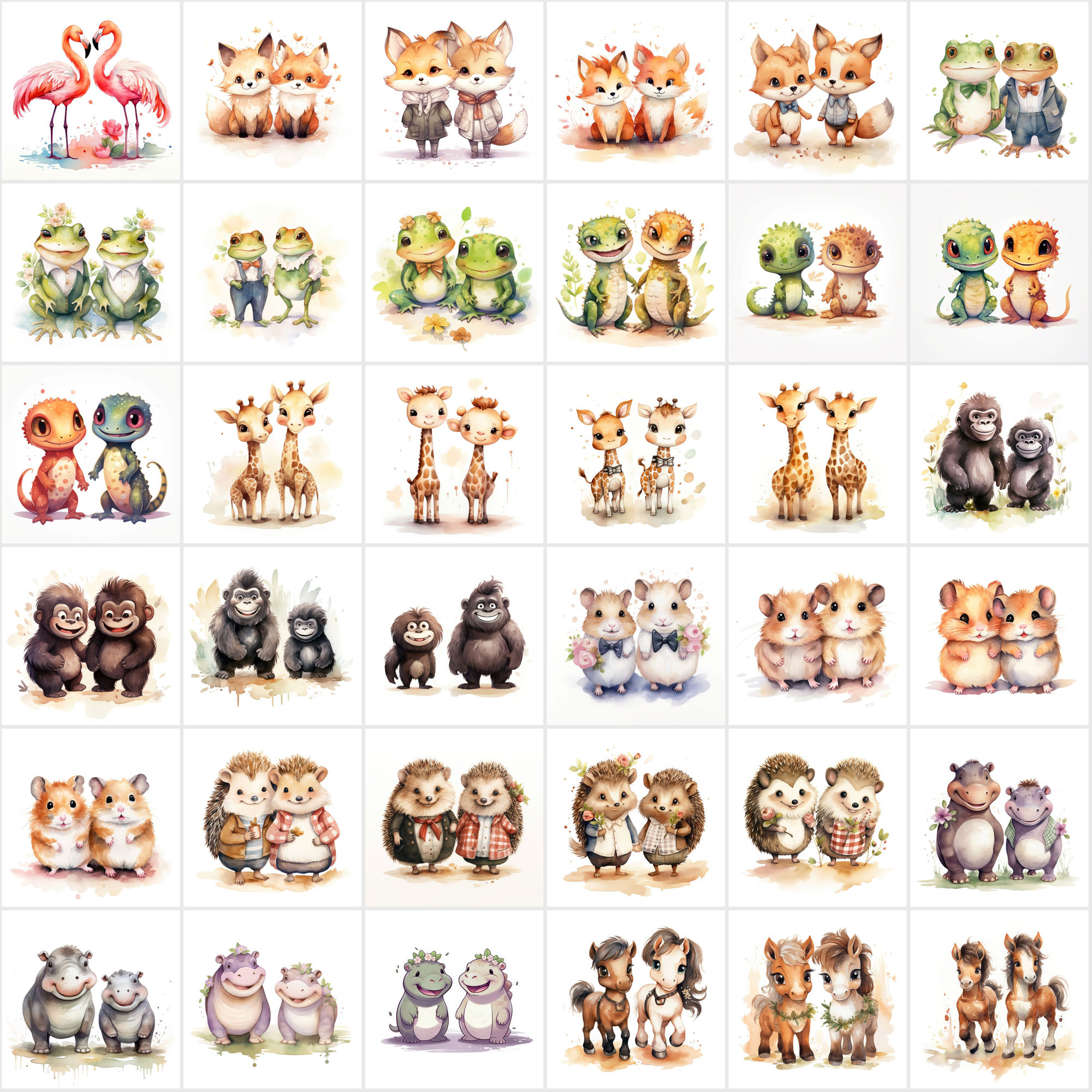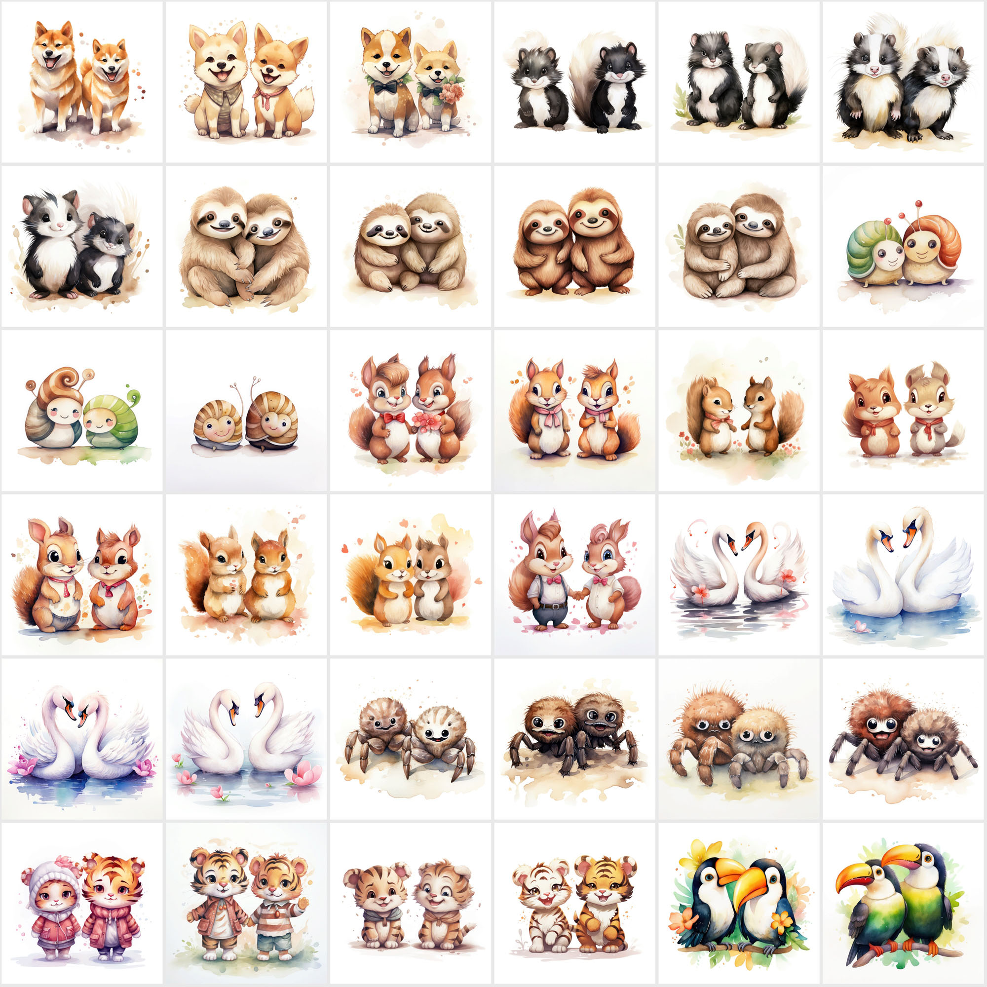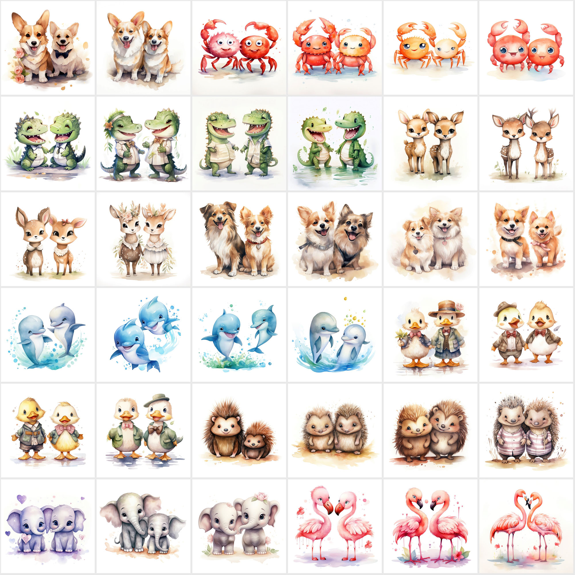 Step into a world of whimsy and harmony with our “Enchanted Couples” collection, featuring over 370 exquisite watercolor illustrations of animal pairs. This captivating assortment showcases male and female animals from the same species, artfully paired to create images that resonate with balance, unity, and beauty. Rendered in stunning watercolor, each illustration vibrates with lively hues and delicate brushwork, making them perfect for a wide array of creative projects.