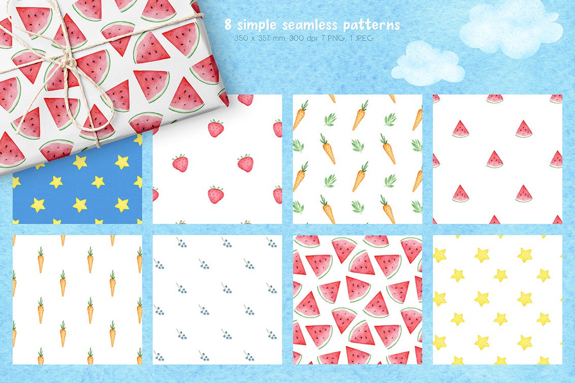 - Seamless patterns Simple: 7 PNG, 1 JPEG (350×357 mm)