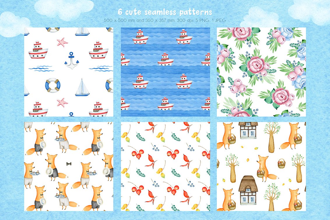 - Seamless patterns Cute: 5 PNG, 1 JPEG (500×500 mm and 350×357 mm)