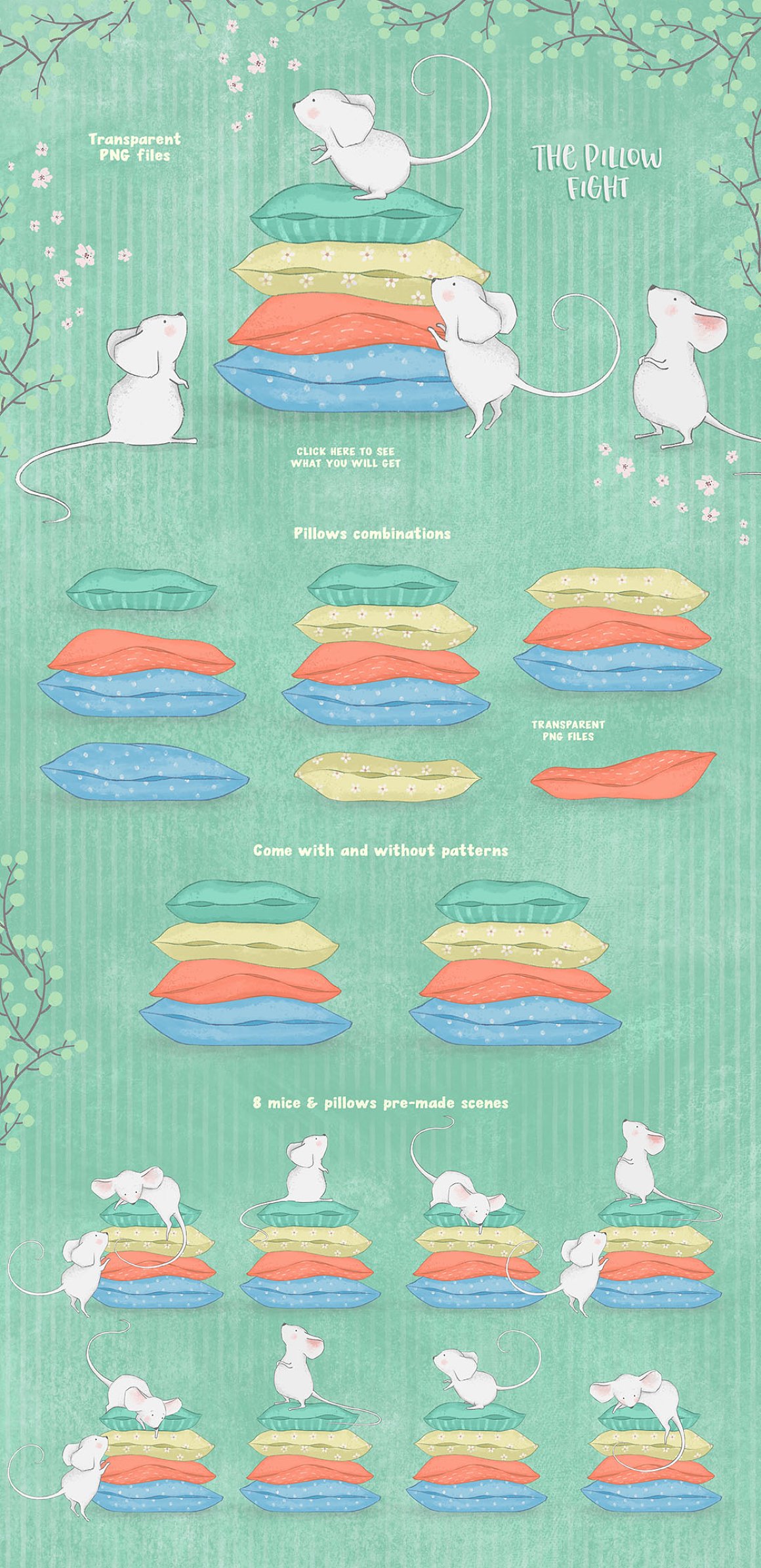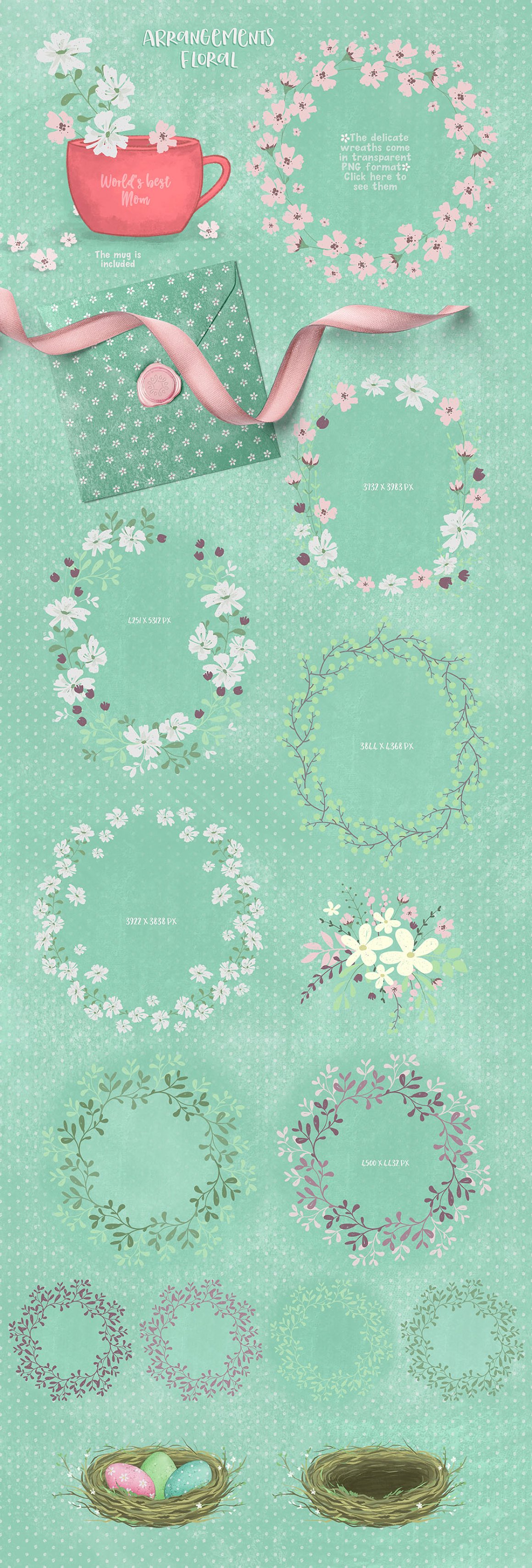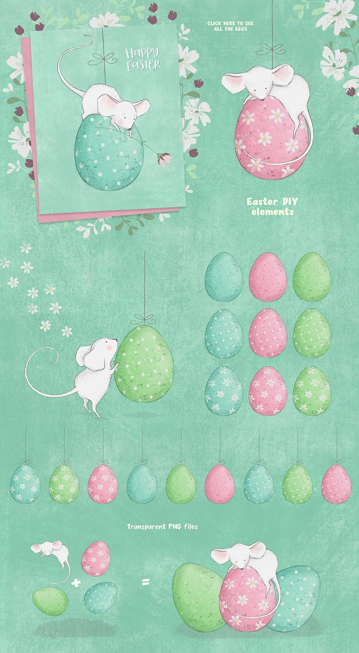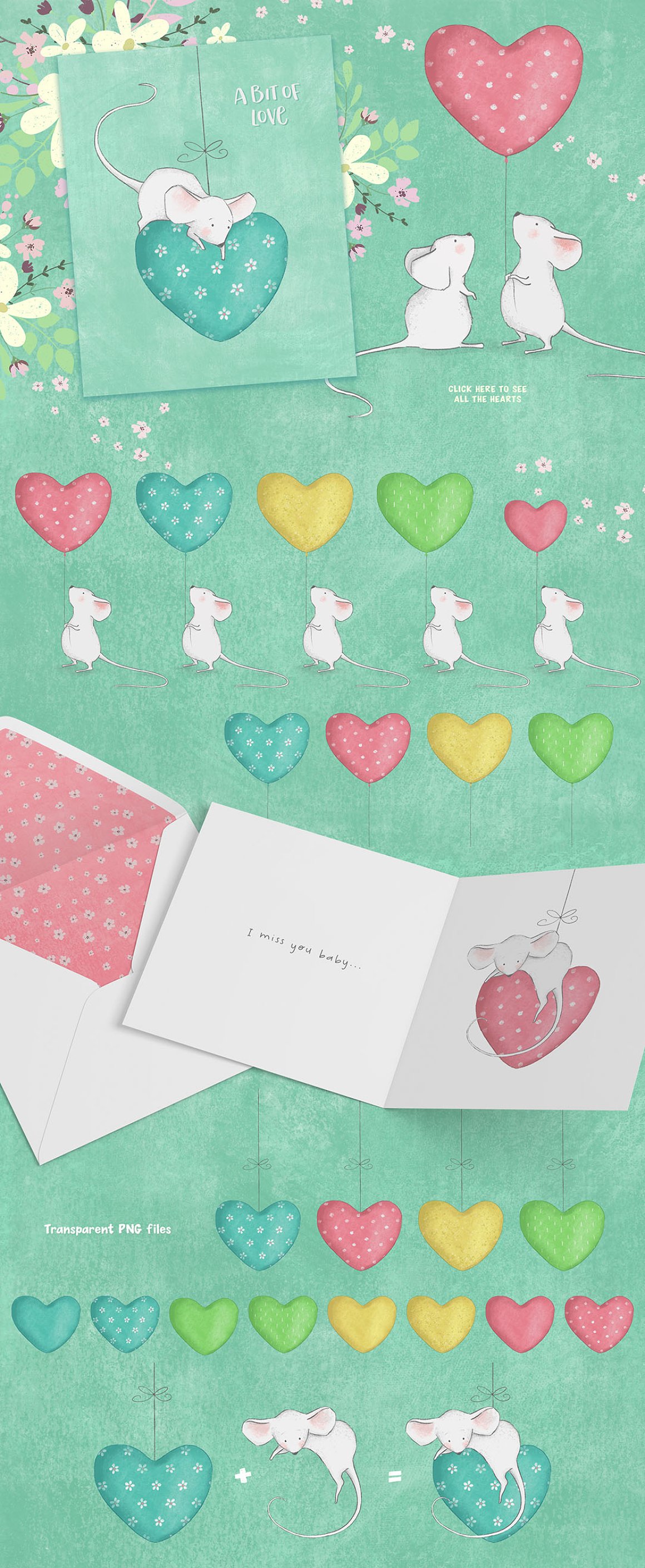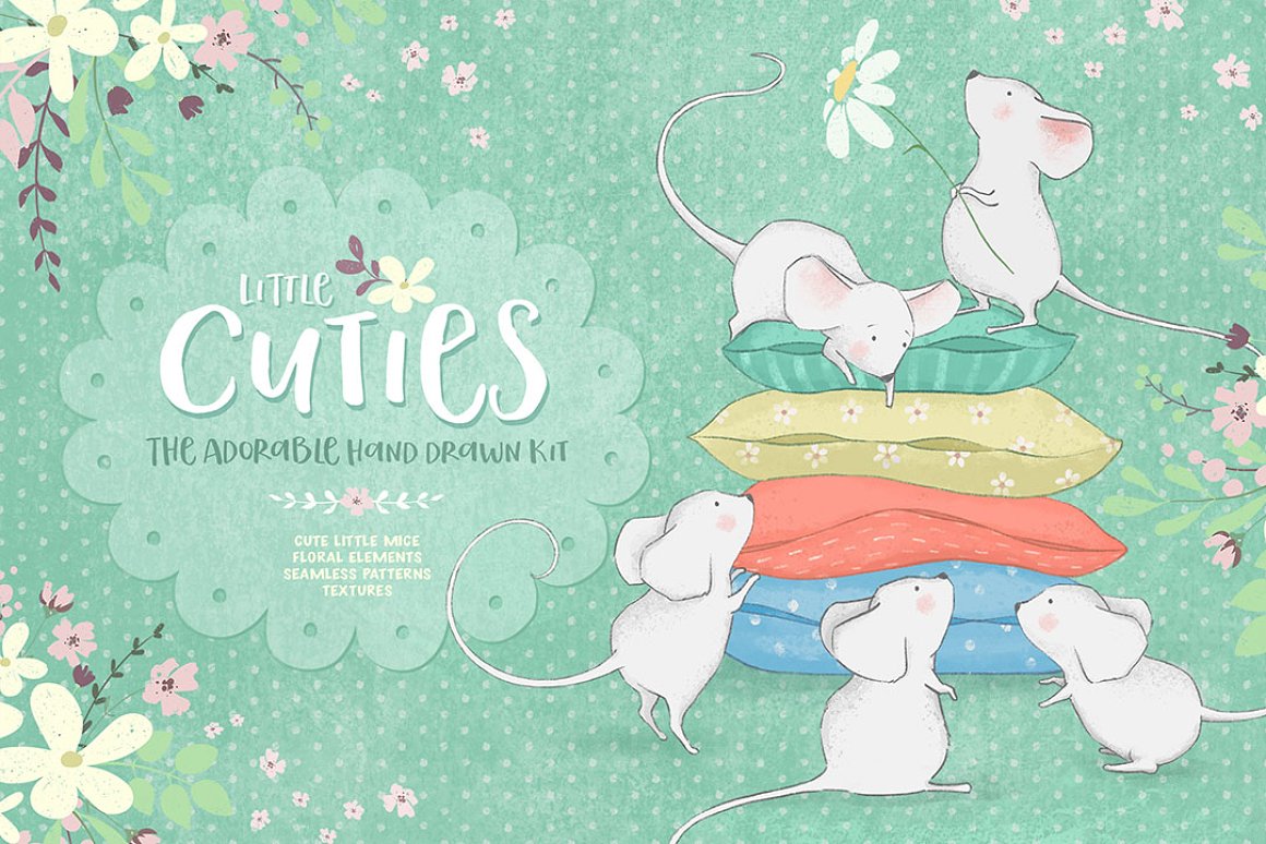I hope you love my cute little ones. They are naughty a little but still cute 🙂 There are hand drawn floral elements, funny mice, variations and different scenes, seamless patterns, pre-made cards examples and textures in this unique collection. It’s perfect for Easter, birthday, Vilentine’s Day, for print and for your own pleasure. Just take a look 🙂 365 PNG files, 85 JPEG files. The JPEG files and PNG files are 300 ppi. PNG files are transparent