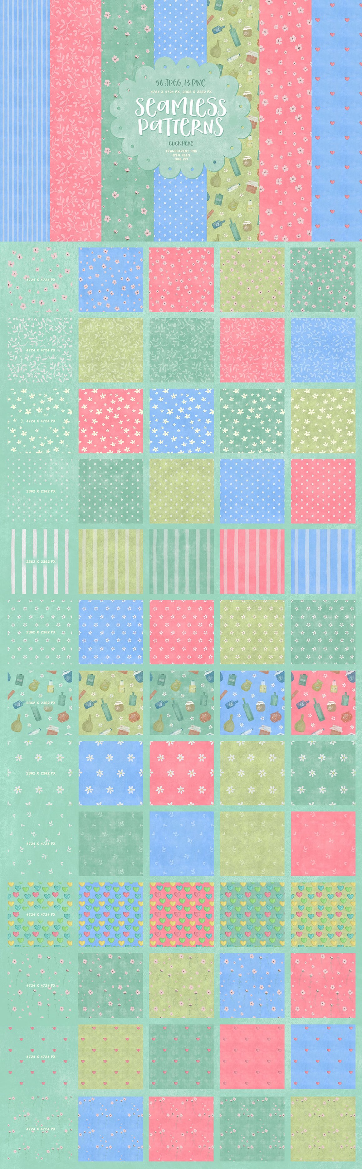 - Seamless patterns: 56 JPEG, 13 PNG (4724 x 4724px, 2362 x 2362px)