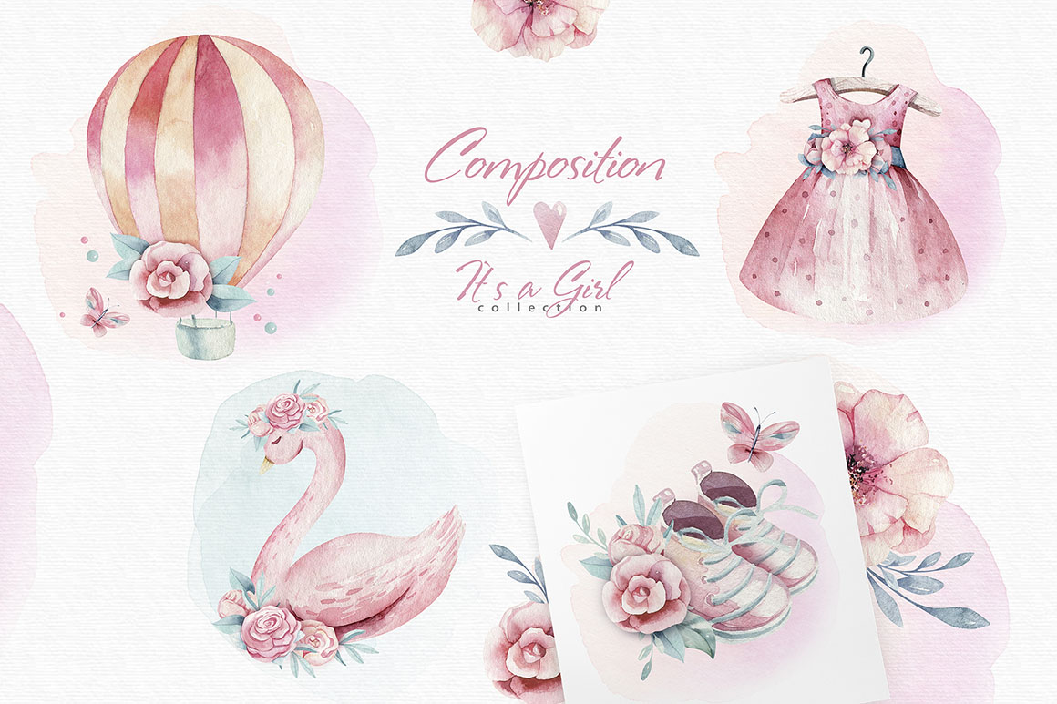 This set of high quality hand painted watercolor baby girl’s world elements.