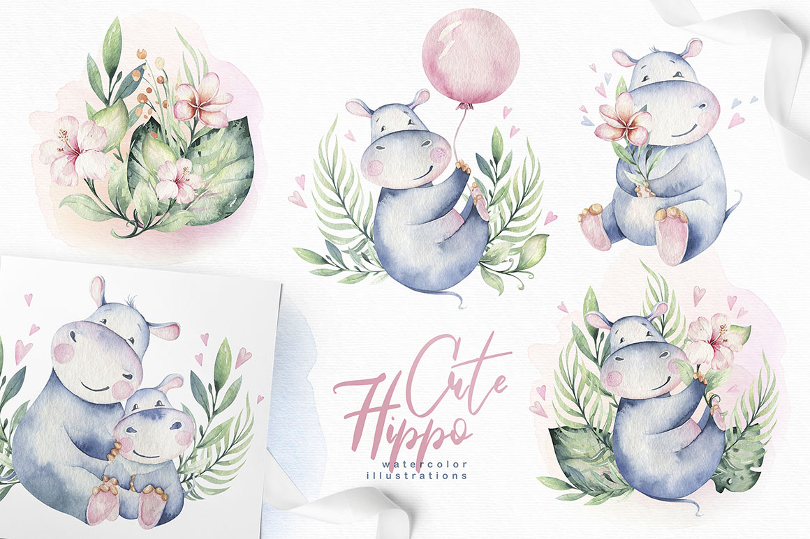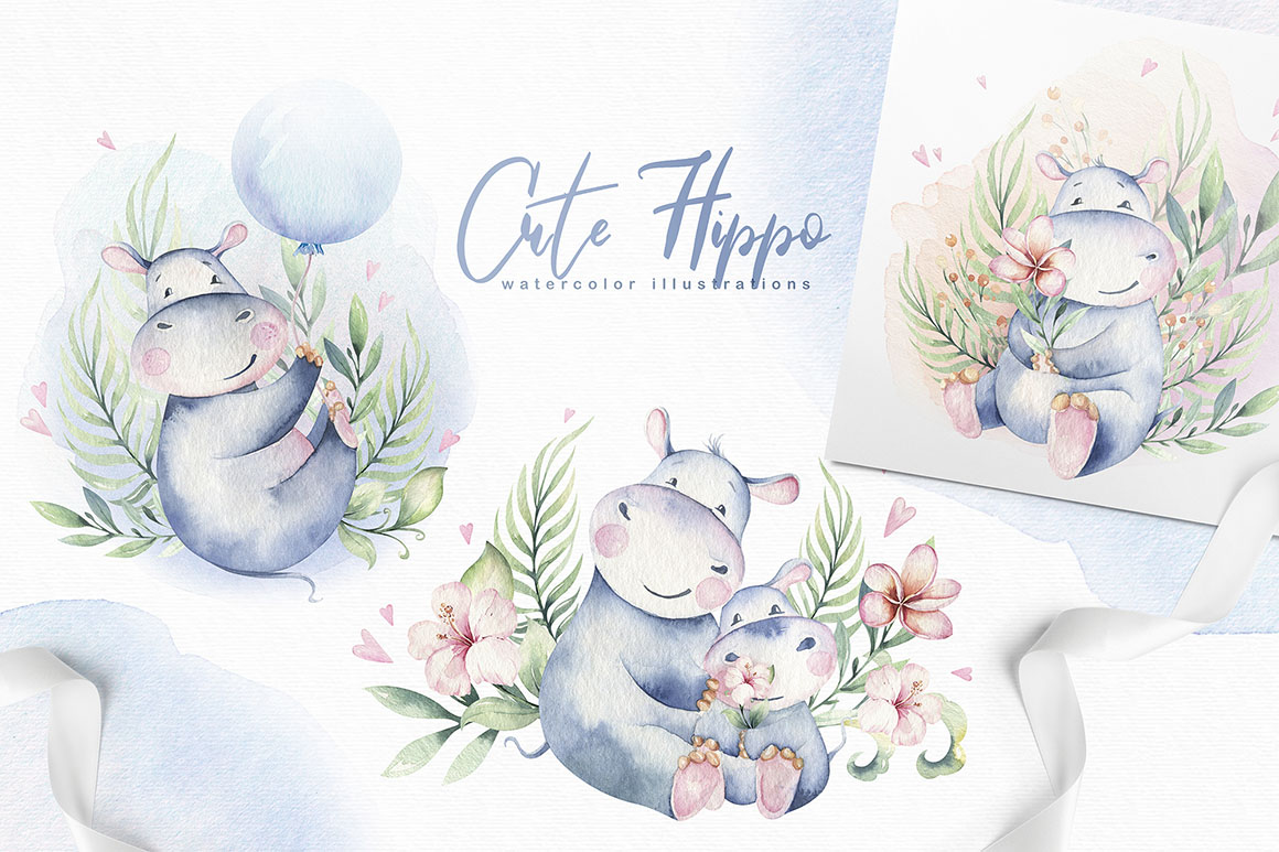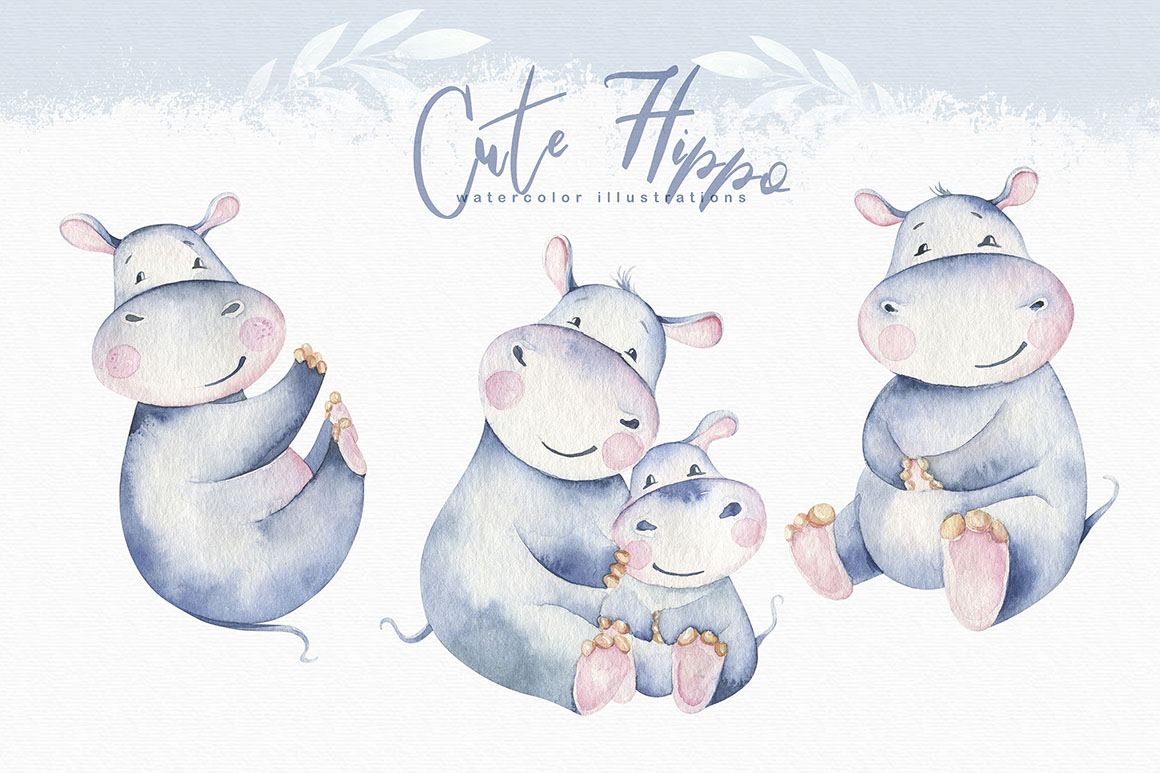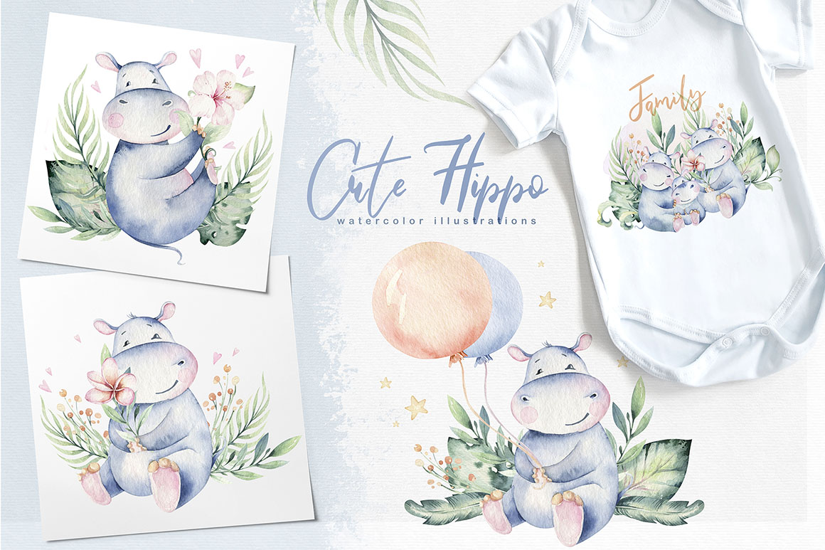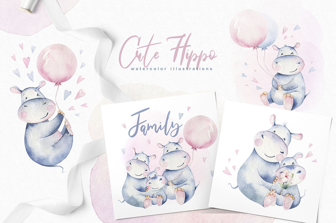 1. Cute watercolor hippo family from Peace ART