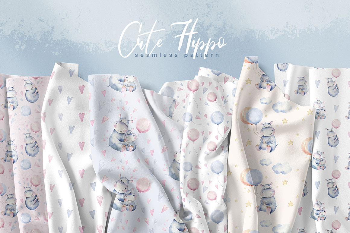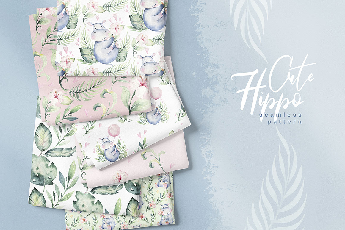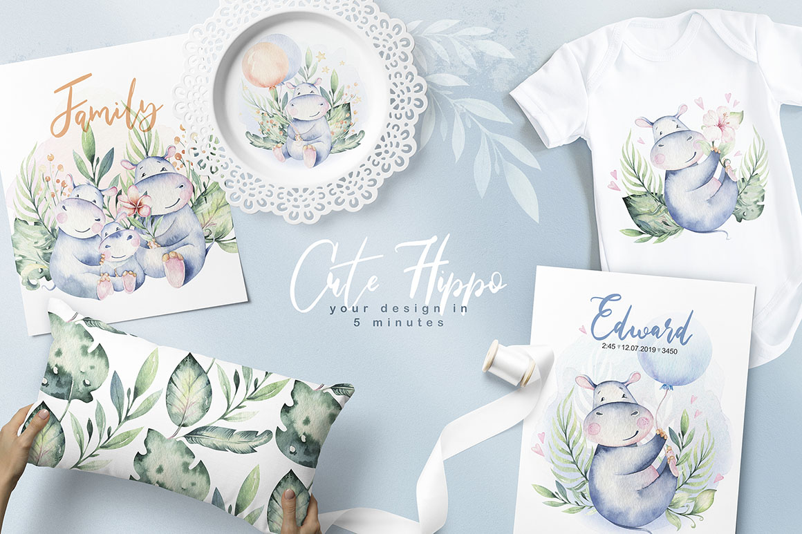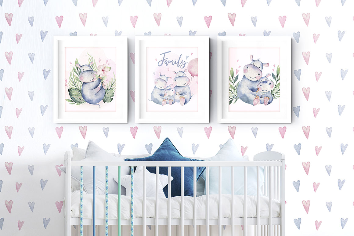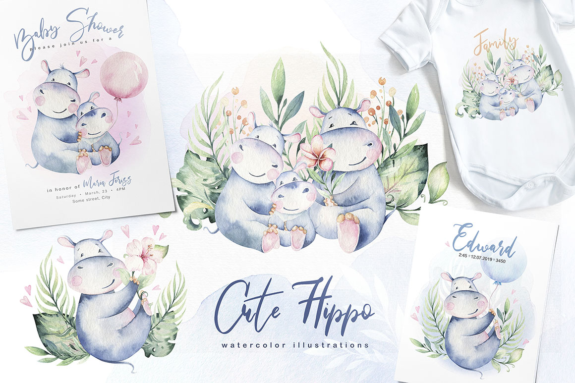 1. Cute watercolor hippo family from Peace ART