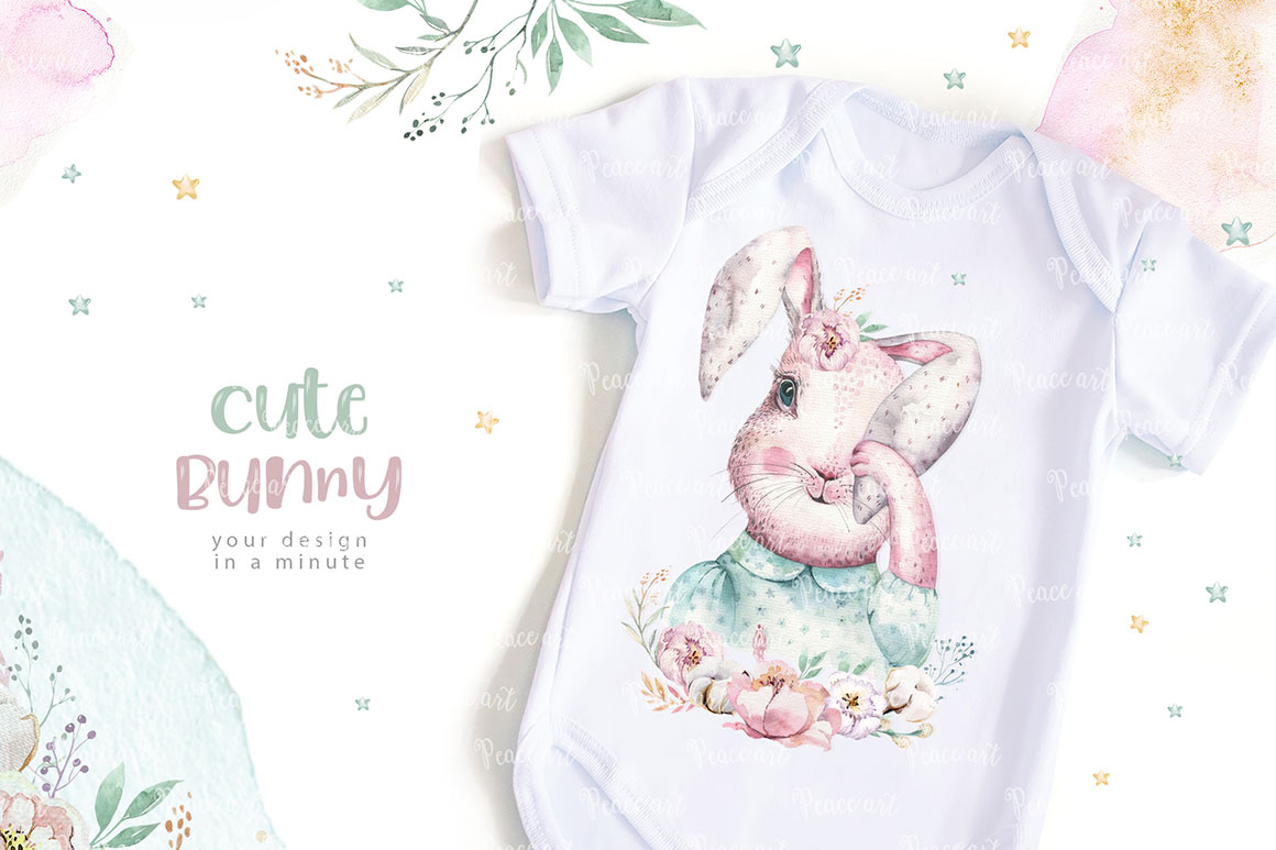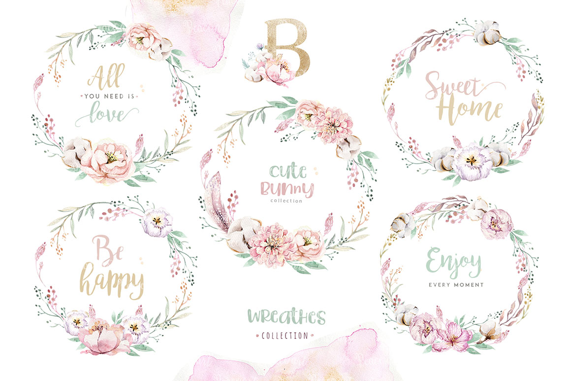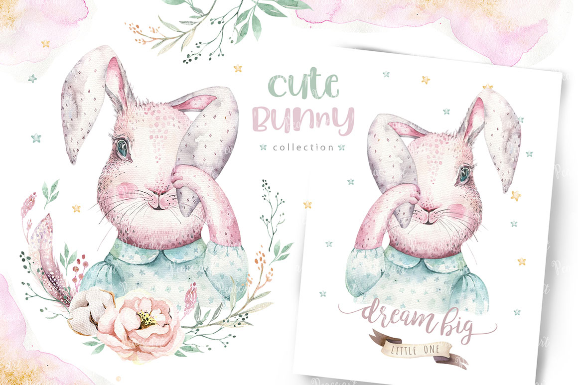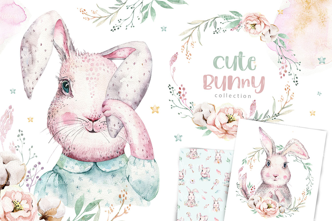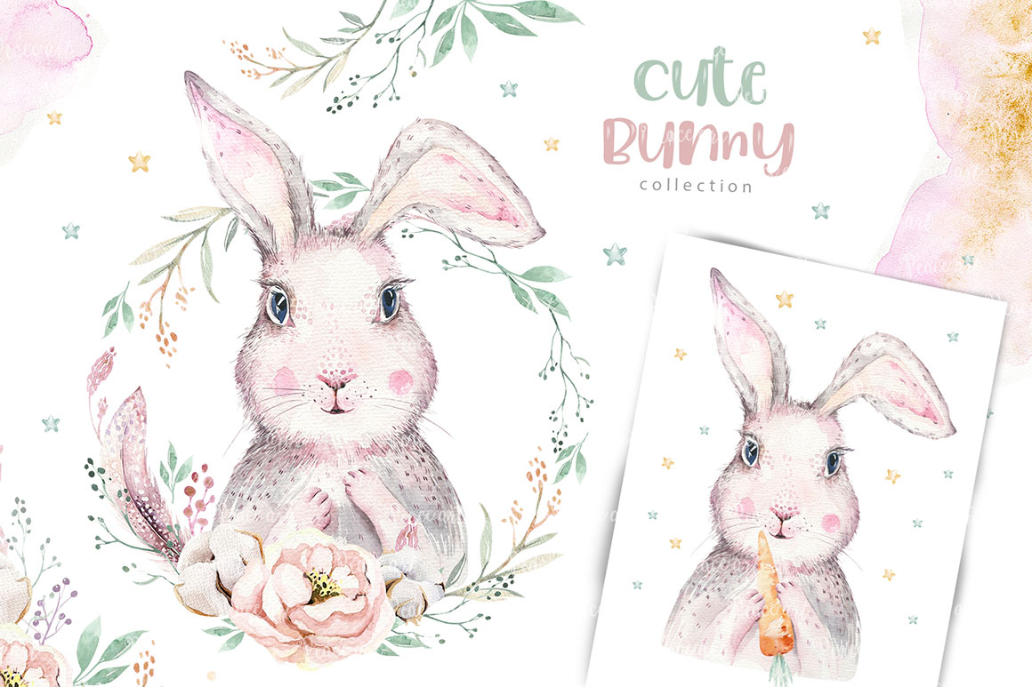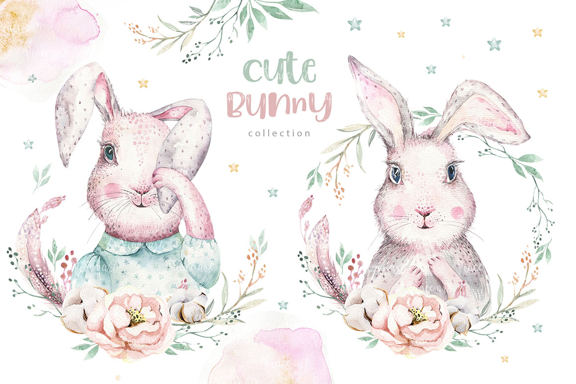 This set of high quality hand painted easter watercolor: bunnies, feathers, and floral elements. Boho style. Perfect graphic for DIY, wedding invitations, greeting cards, quotes, blogs, posters and more.