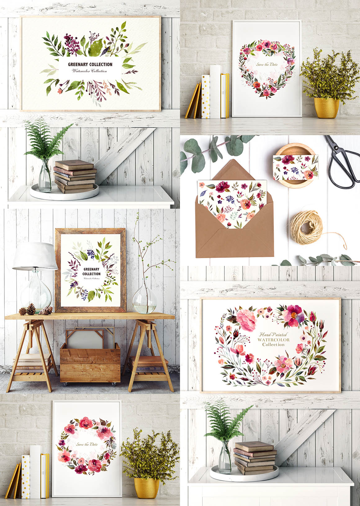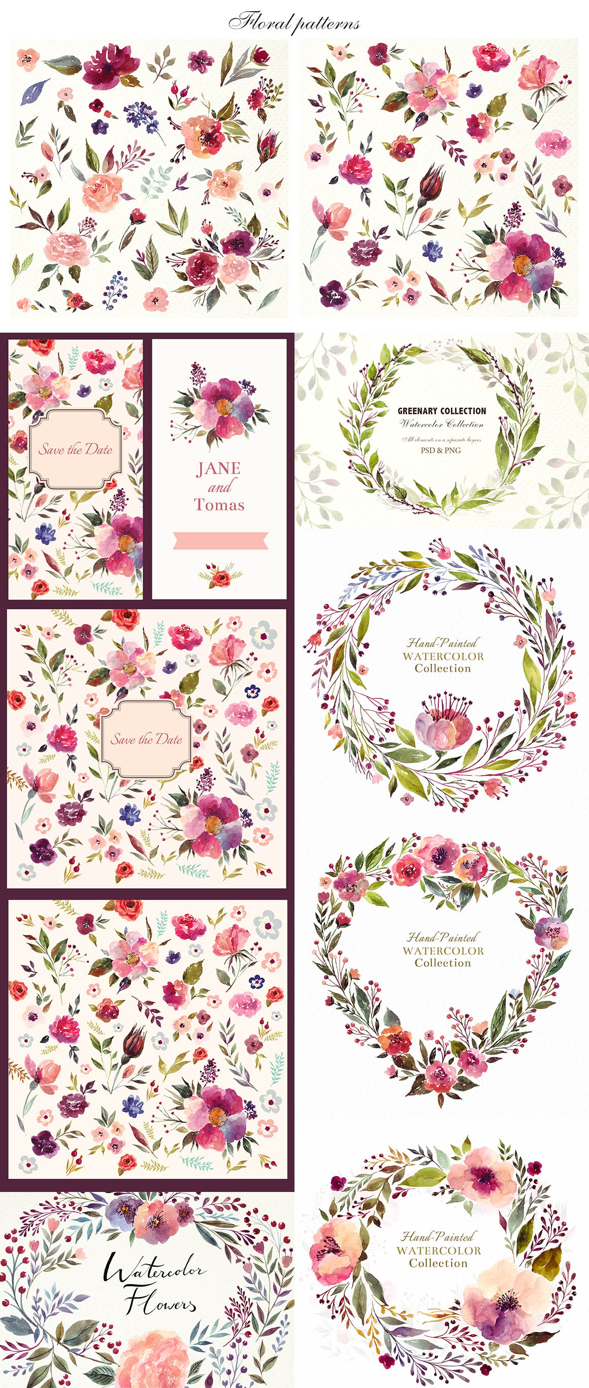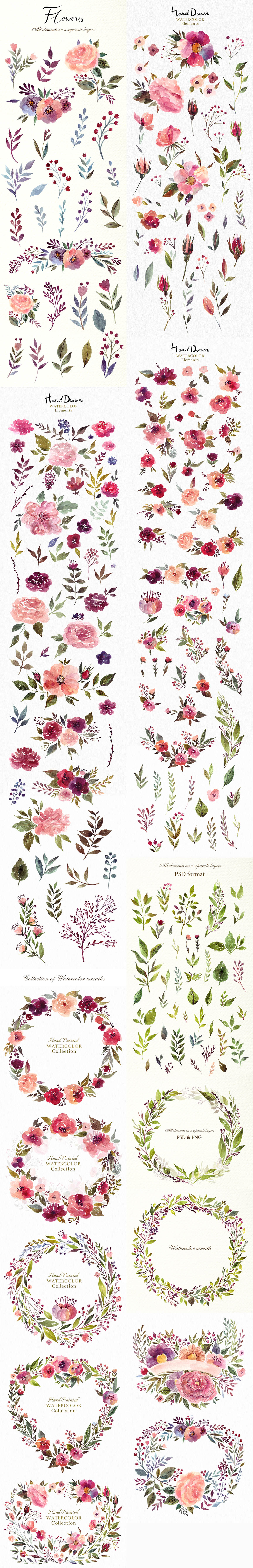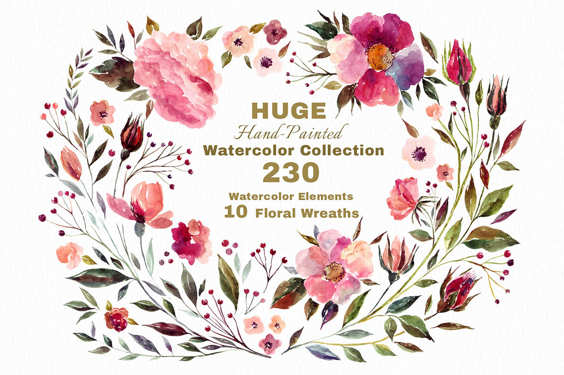 Huge collection of amazing watercolor elements, wreaths, flowers, leaves, branches and patterns. Collection included 230 watercolor elements in PSD and PNG formats and 9 Watercolor Floral Wreaths.All elements are on separate layers in PSD formats. All items are very easy to use. All watercolor elements are in a high resolution 300 dpi. With this collection, you will be able to create your own wedding invitations, posters and greeting card designs with handdrawn watercolor flowers and leaves. The collection is perfect for wedding invitations, greeting cards, art prints, logos, labels, packaging, posters, websites, badges and other.
