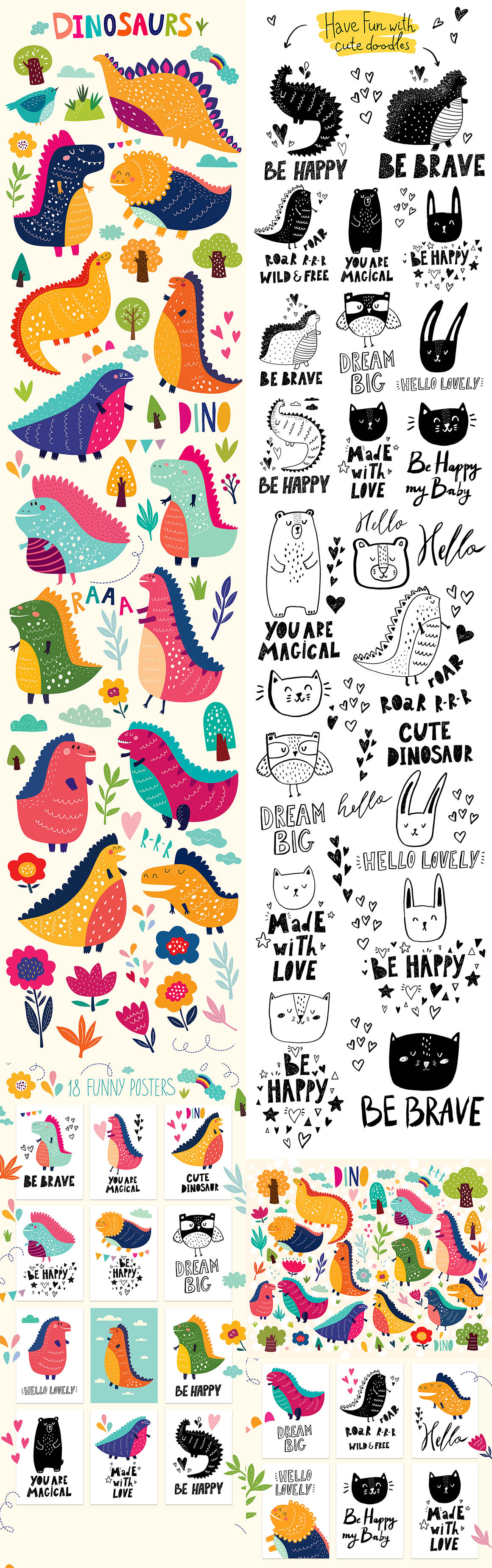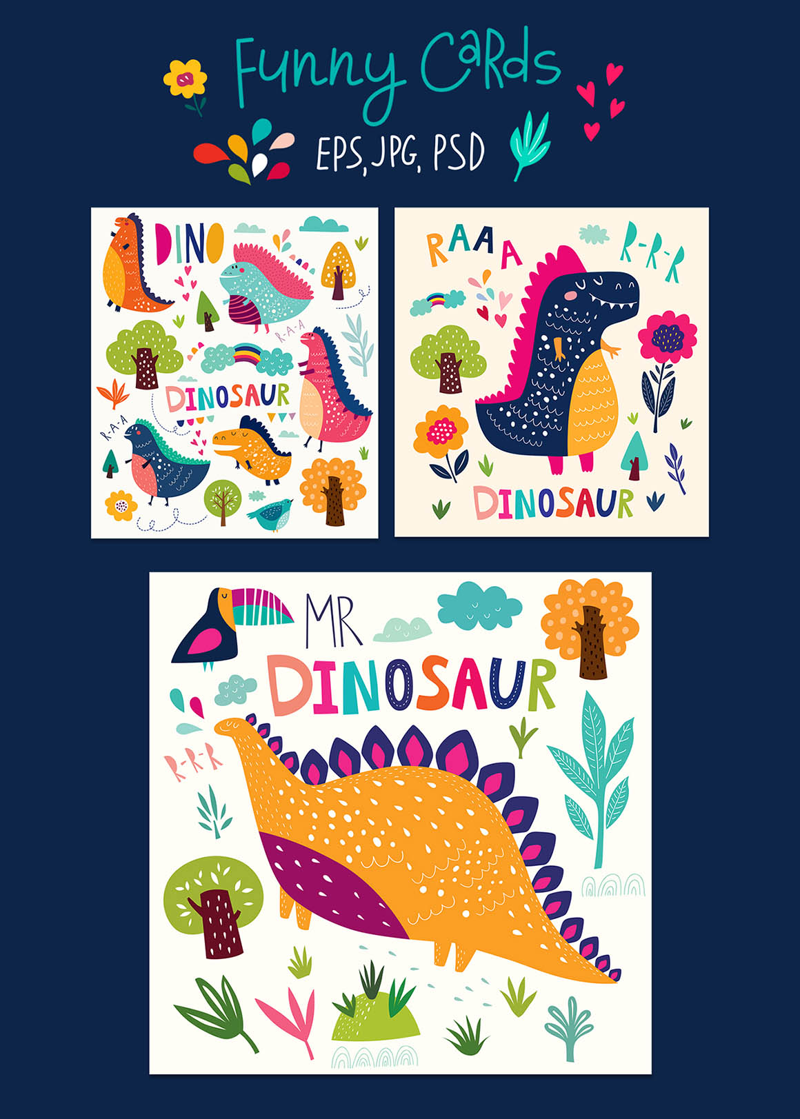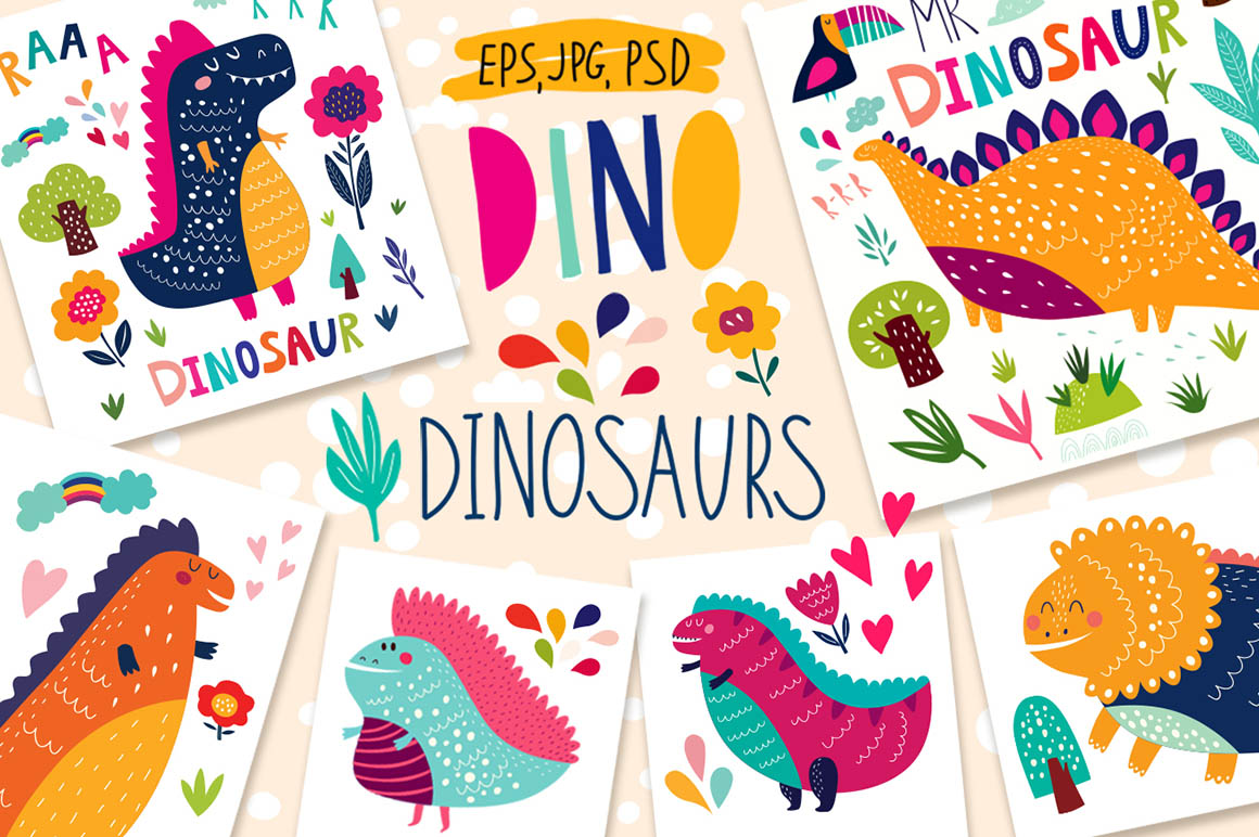 - 58 colorful dinosaurs and decorative elements in PSD format (All elements on separate layers, 300 dpi)
