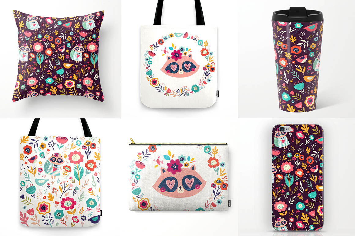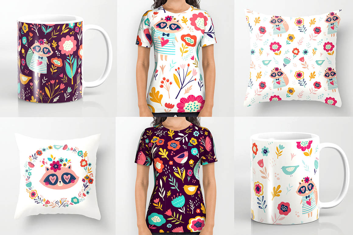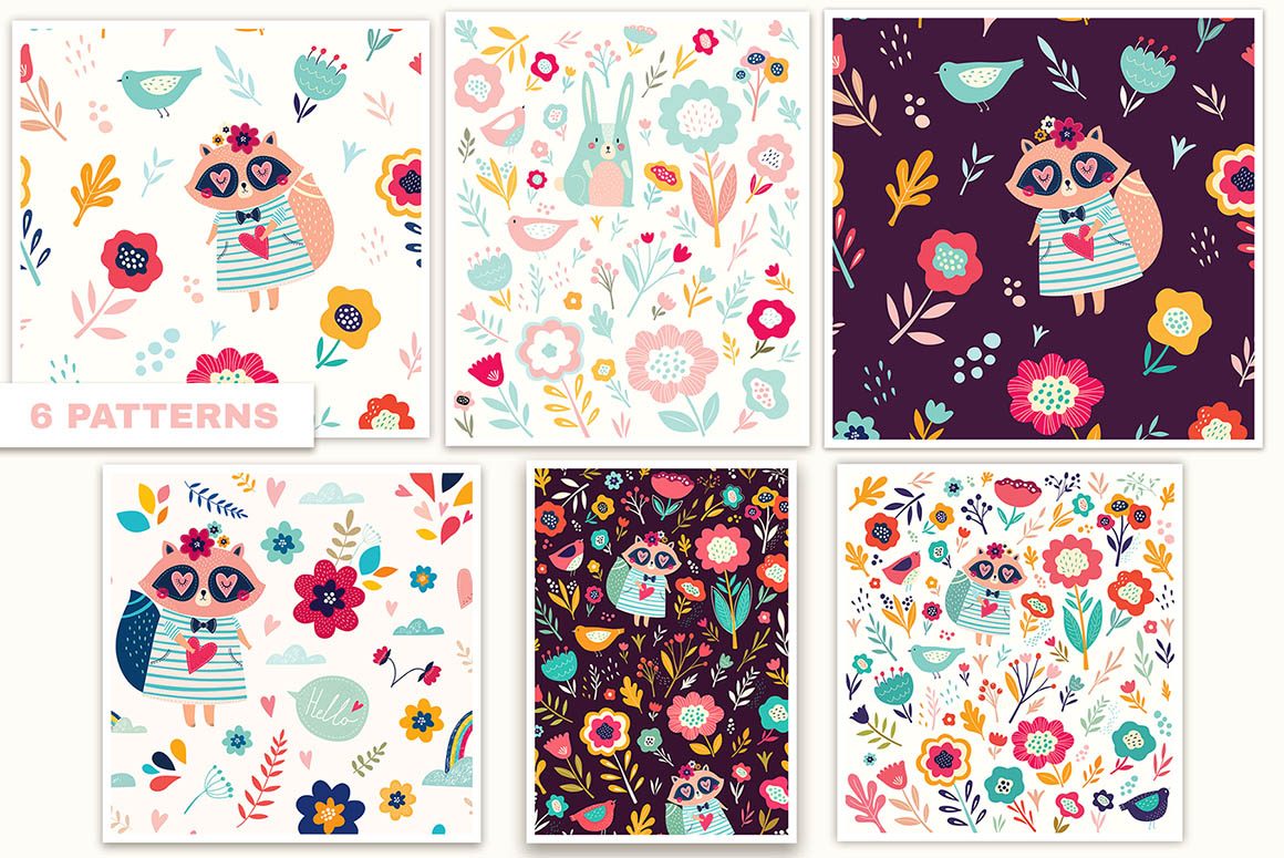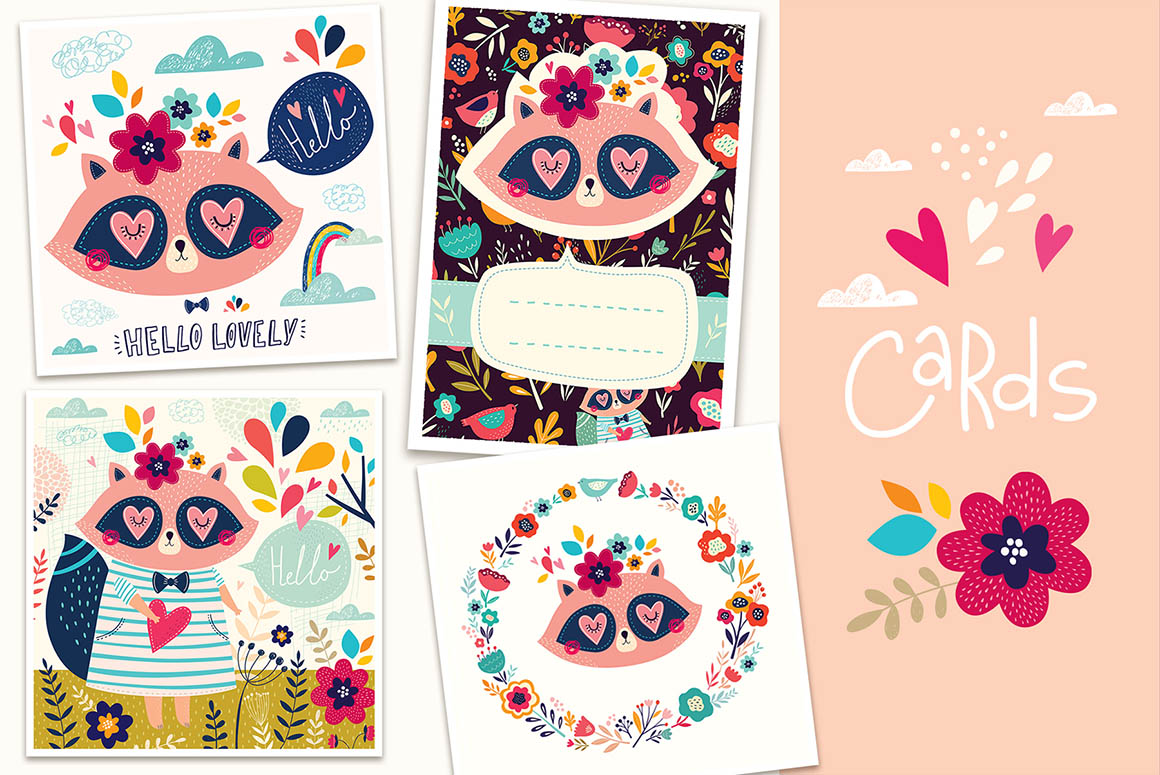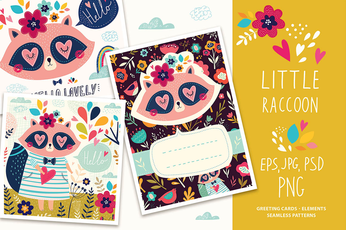 Introducing collection with adorable character the Cute Little Raccoon. Collection Included greeting cards, seamless patterns with cute raccoon, tags, decorative elements, symbols, flowers.