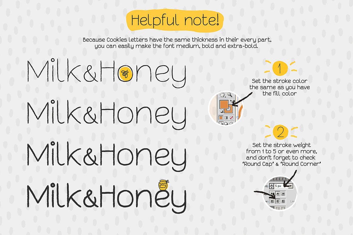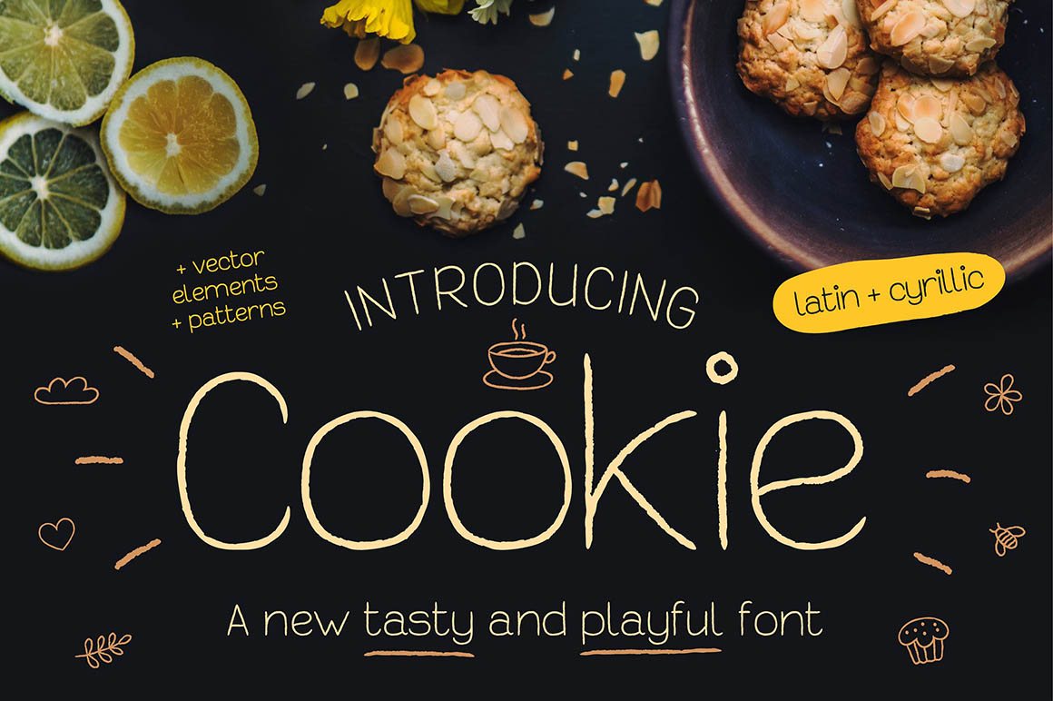 Also, Cookie includes not only latin, but also cyrillic characters, symbols and numerals, 184 glyphs totally. The font is thin, but you can make it medium or bold, by adding a stroke (check out the last preview)