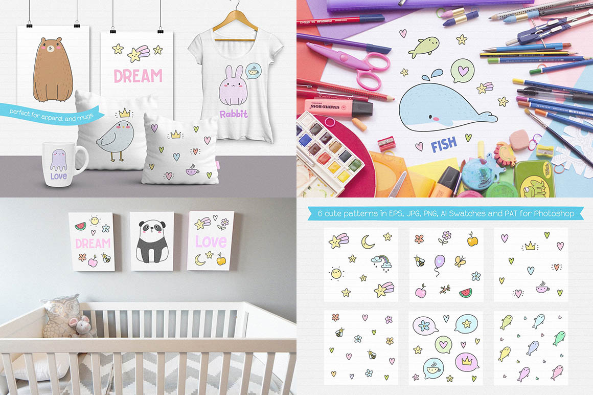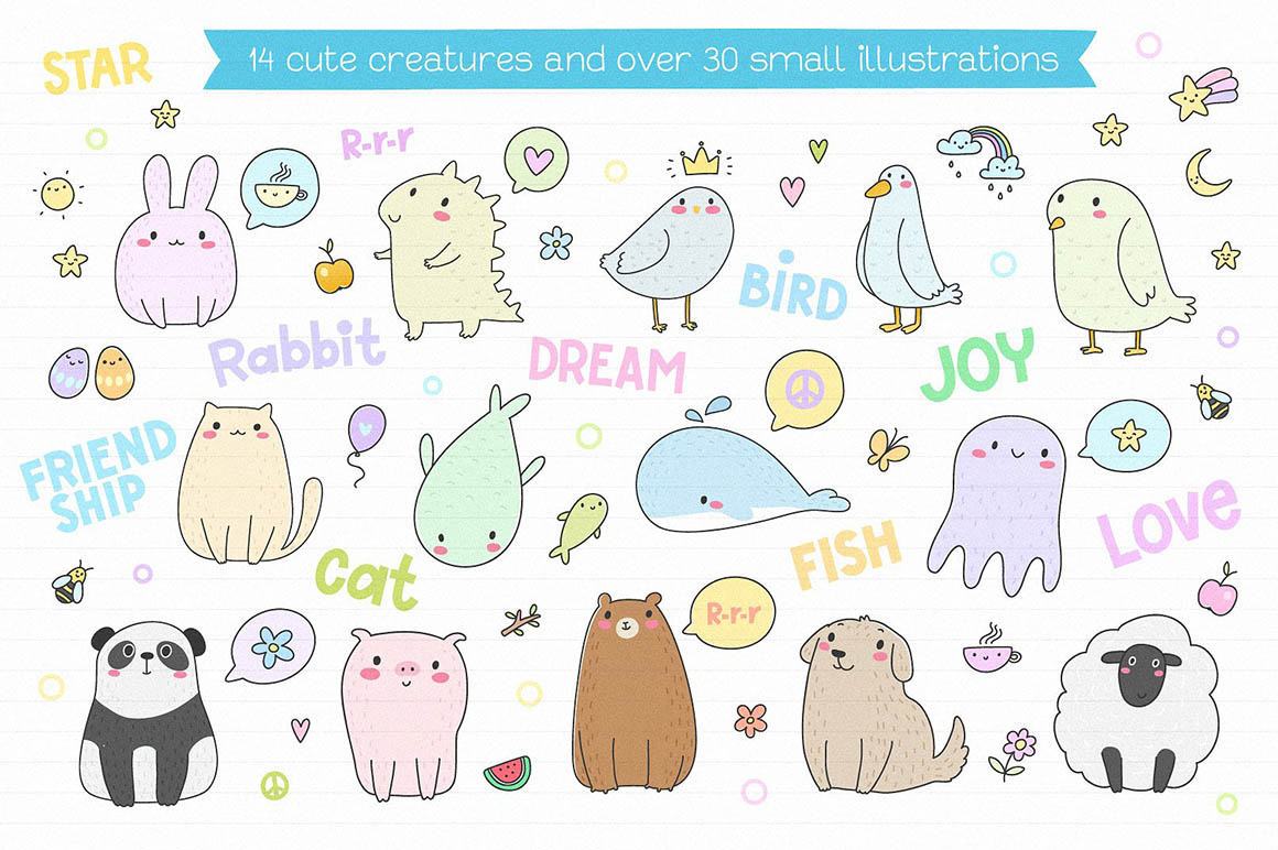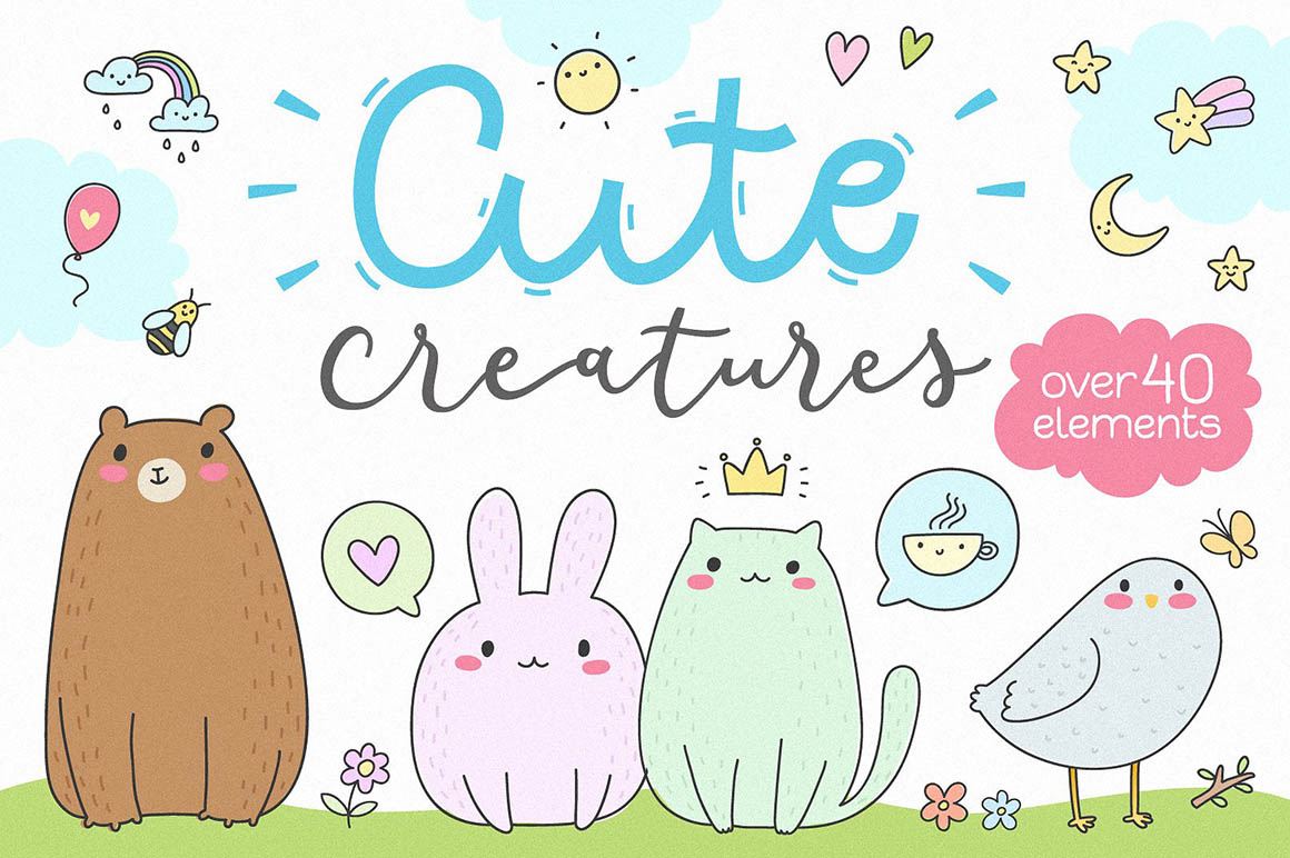 Let me introduce new Cute Creatures vector Set – over 40 elements in all popular file formats + 6 seamless vector patterns.
