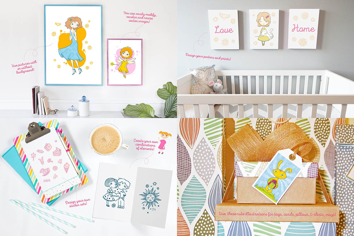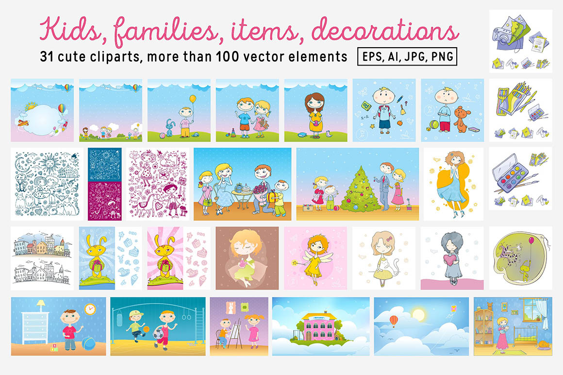 “Kids and Families” is a bundle of vector images: 31 compositions with over 100 vector images (it’s a bit hard to count them up…:) Please check out the second preview – there is exactly what the set contains.