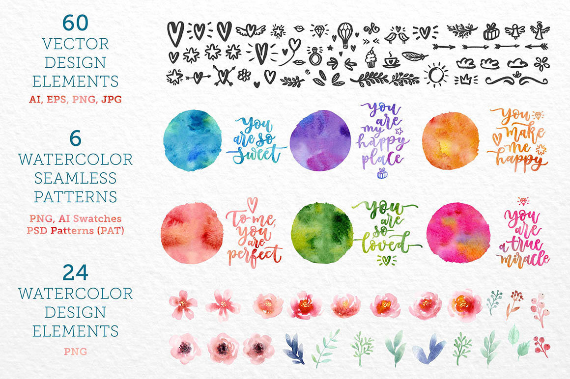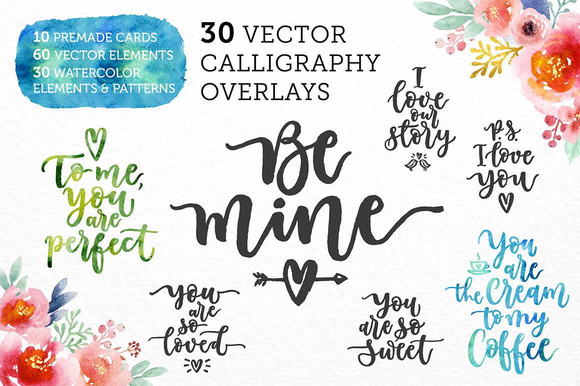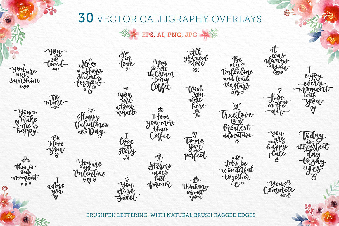 - 30 Vector Overlays (Cute and romantic calligraphy quotes): 30 EPS vector files, 30 transparent PNG files (black and white) and 30 JPGs (both 300 dpi), 2 AI files with and without artboards.