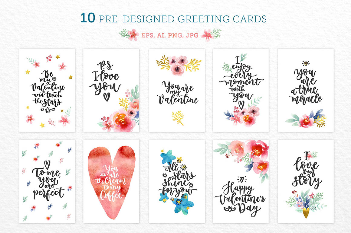 - 10 premade greeting cards, in AI, EPS, PSD, PNG, JPG (+ PNG empty background templates; if you need other format templates, AI, EPS and PSD files are fully editable!)