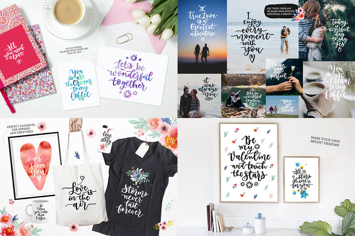 I’m so excited to introduce you a big fancy Romantic Calligraphy Overlays, with many cool bonuces! All calligraphy quotes in this set are handwritten, with no fonts used. Every letter is unique! Letters have natural looking brush edges.
