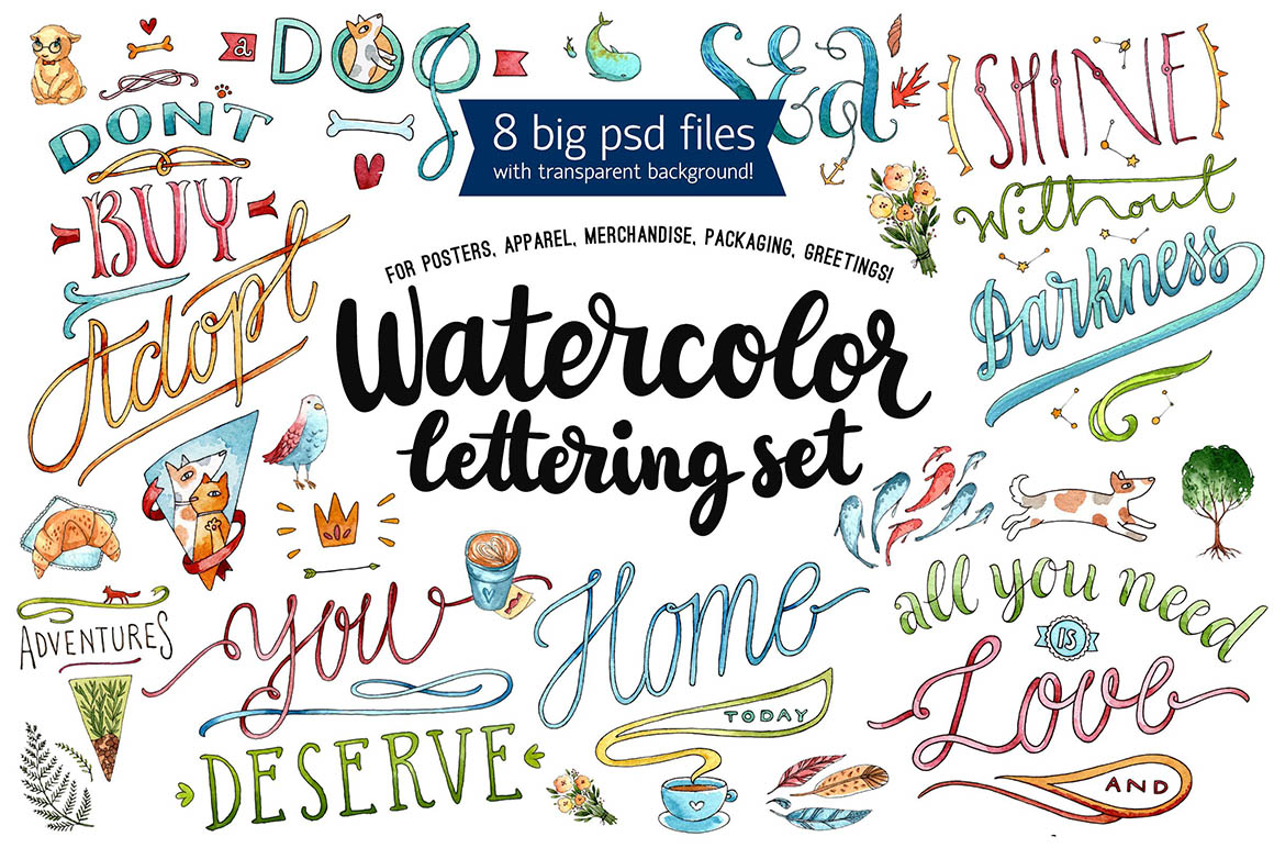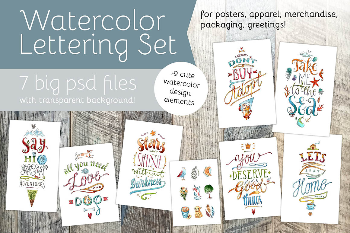 This Watercolor Lettering Set is actually a big bundle of ready to use raster prints! It contains: