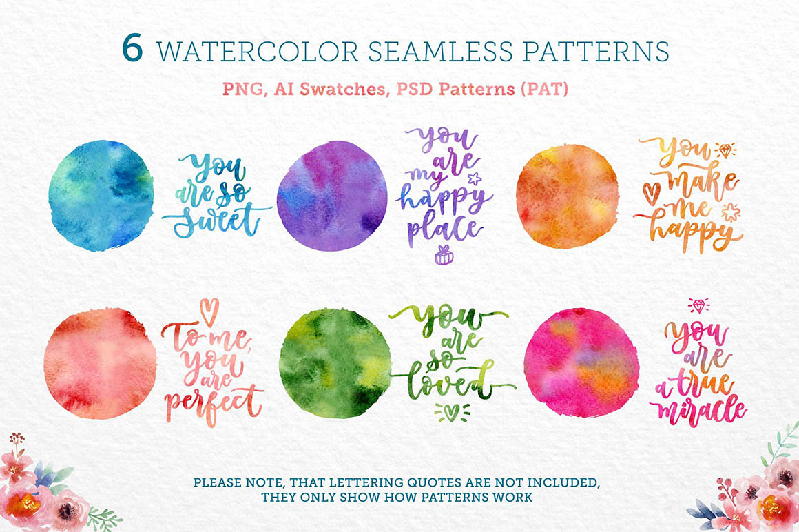 - 6 bright watercolor seamless patterns in PNG, AI Swatches and PAT (Photoshop Patterns)