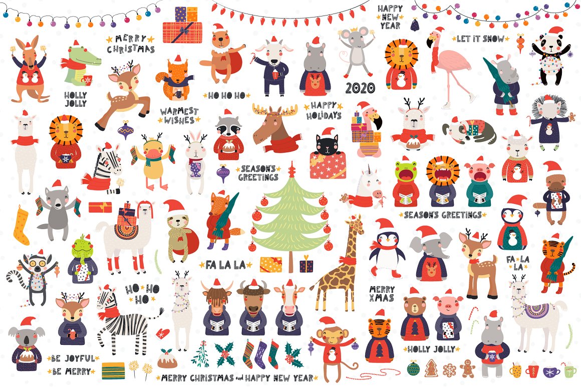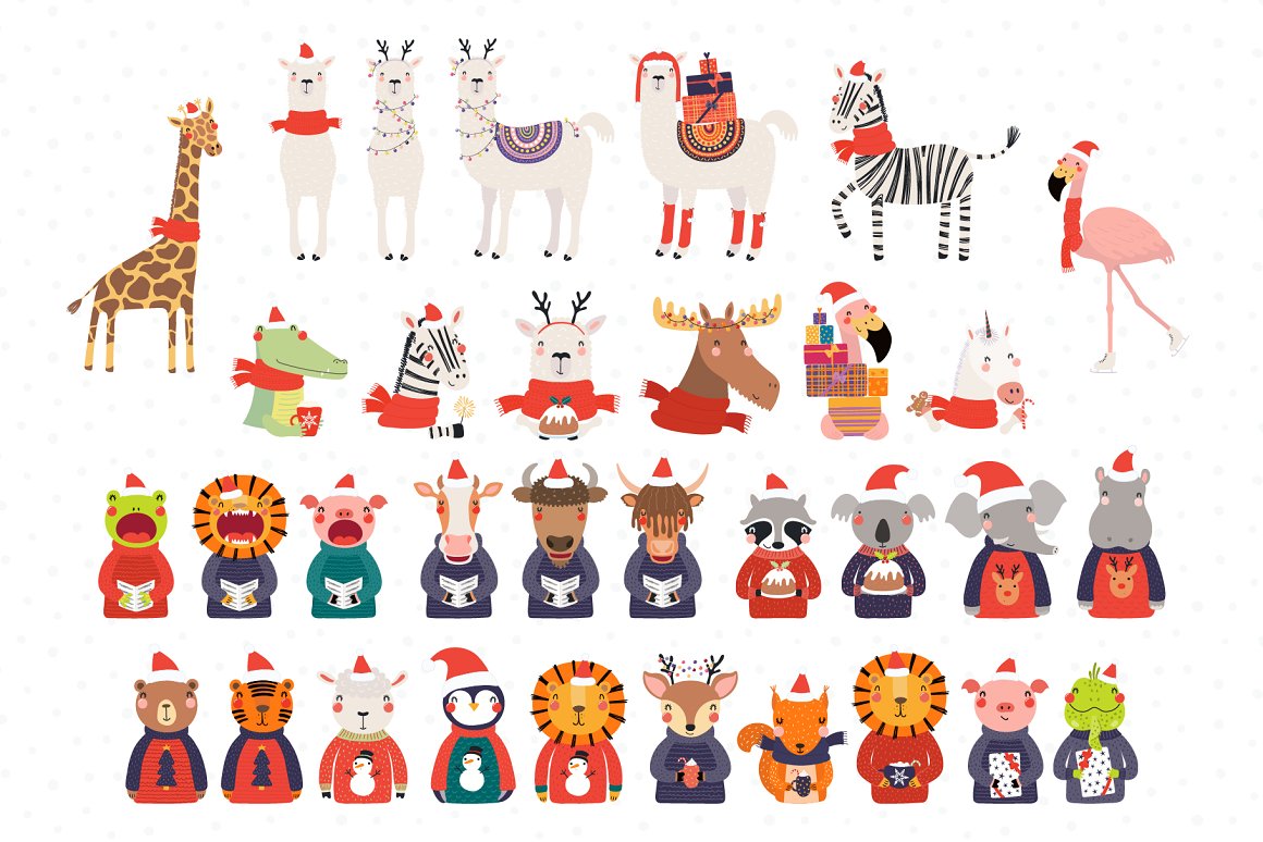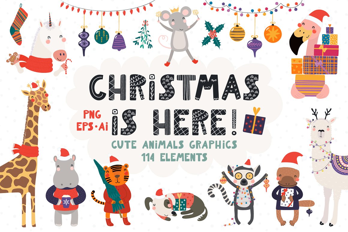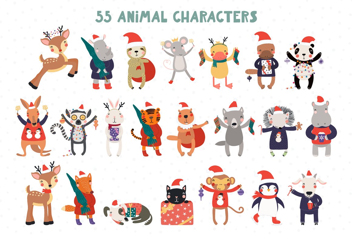 Vector illustrations collection with cute animals, full of Christmas spirit. With addition of festive clipart, hand drawn alphabet, holiday quotes, seamless patterns and pre-made designs, everything you need for your Christmas preparations is here. Inspired by Scandinavian design and Japanese kawaii aesthetic. 114 unique graphic elements total.
