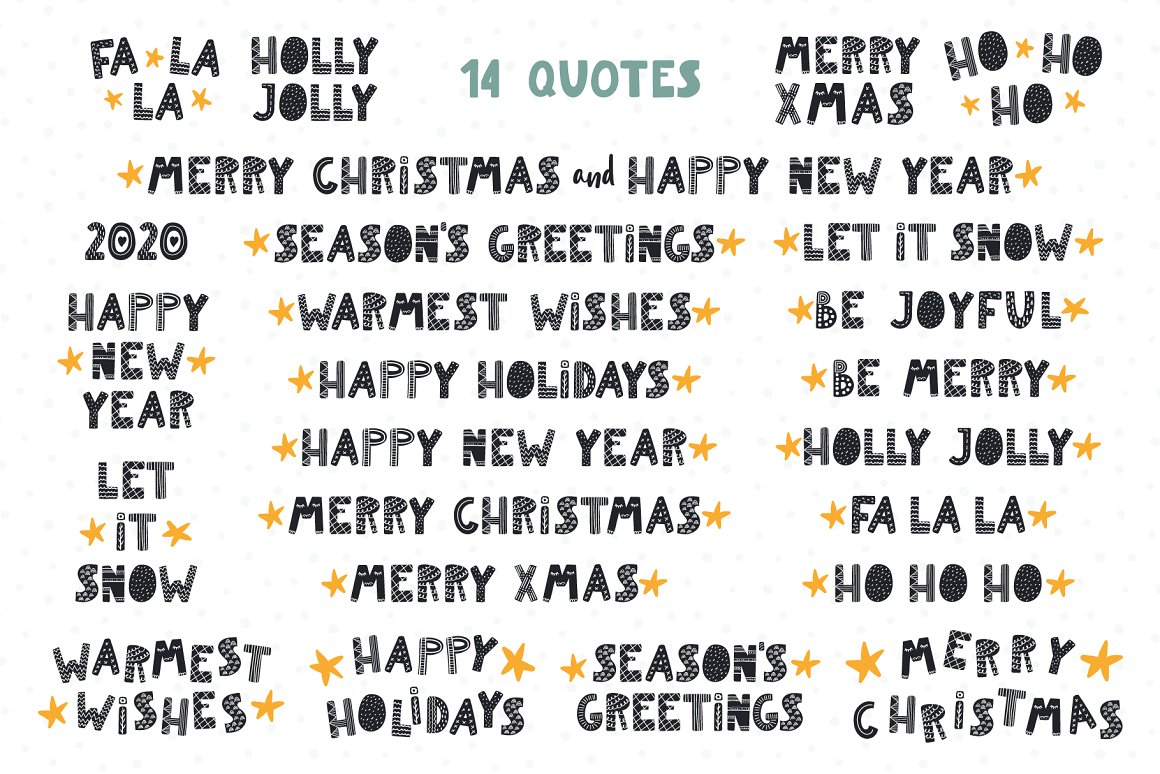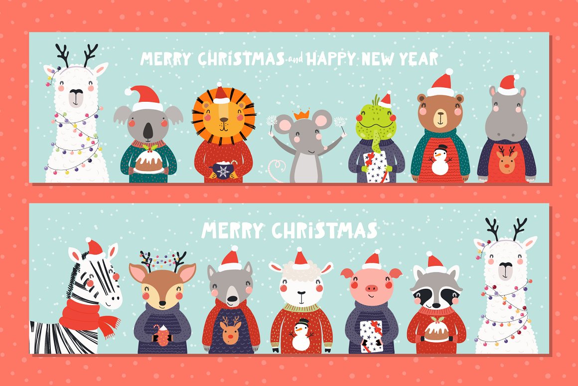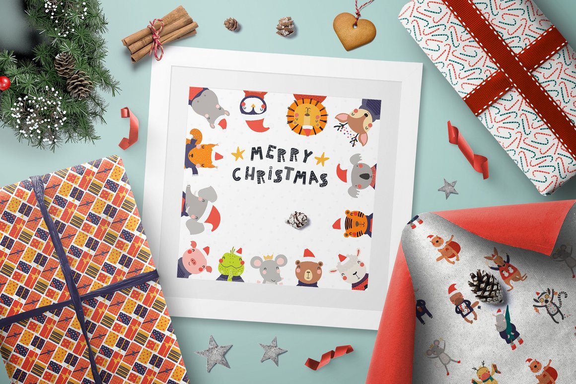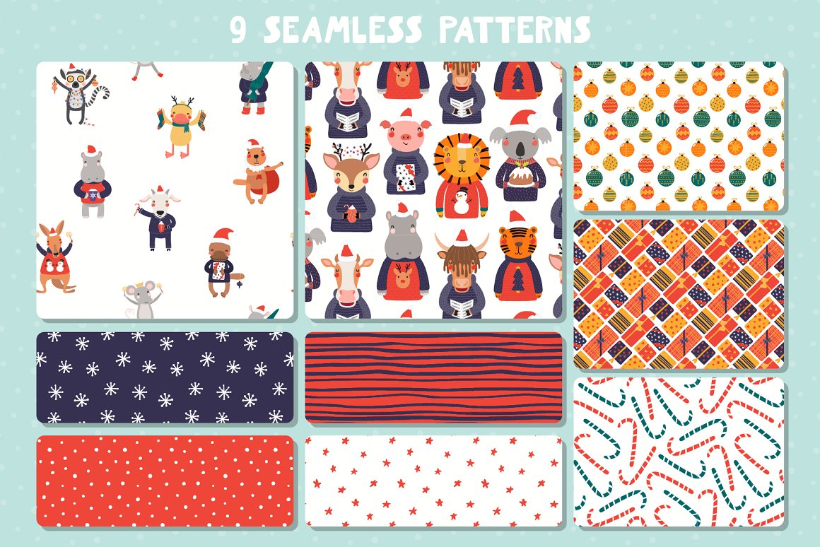 Vector illustrations collection with cute animals, full of Christmas spirit. With addition of festive clipart, hand drawn alphabet, holiday quotes, seamless patterns and pre-made designs, everything you need for your Christmas preparations is here. Inspired by Scandinavian design and Japanese kawaii aesthetic. 114 unique graphic elements total.