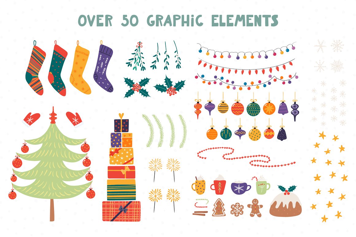 - 59 additional elements, including gifts, Christmas tree, ornaments, garlands, stockings, holly, mistletoe, sparklers, sugar canes, pudding, cup mugs, gingerbread cookies, mittens, stars snowflakes (AI, EPS10, separate high resolution PNG with transparent background)