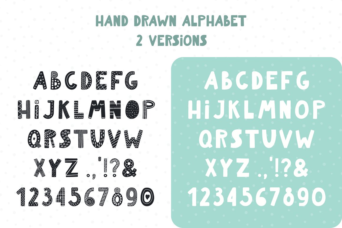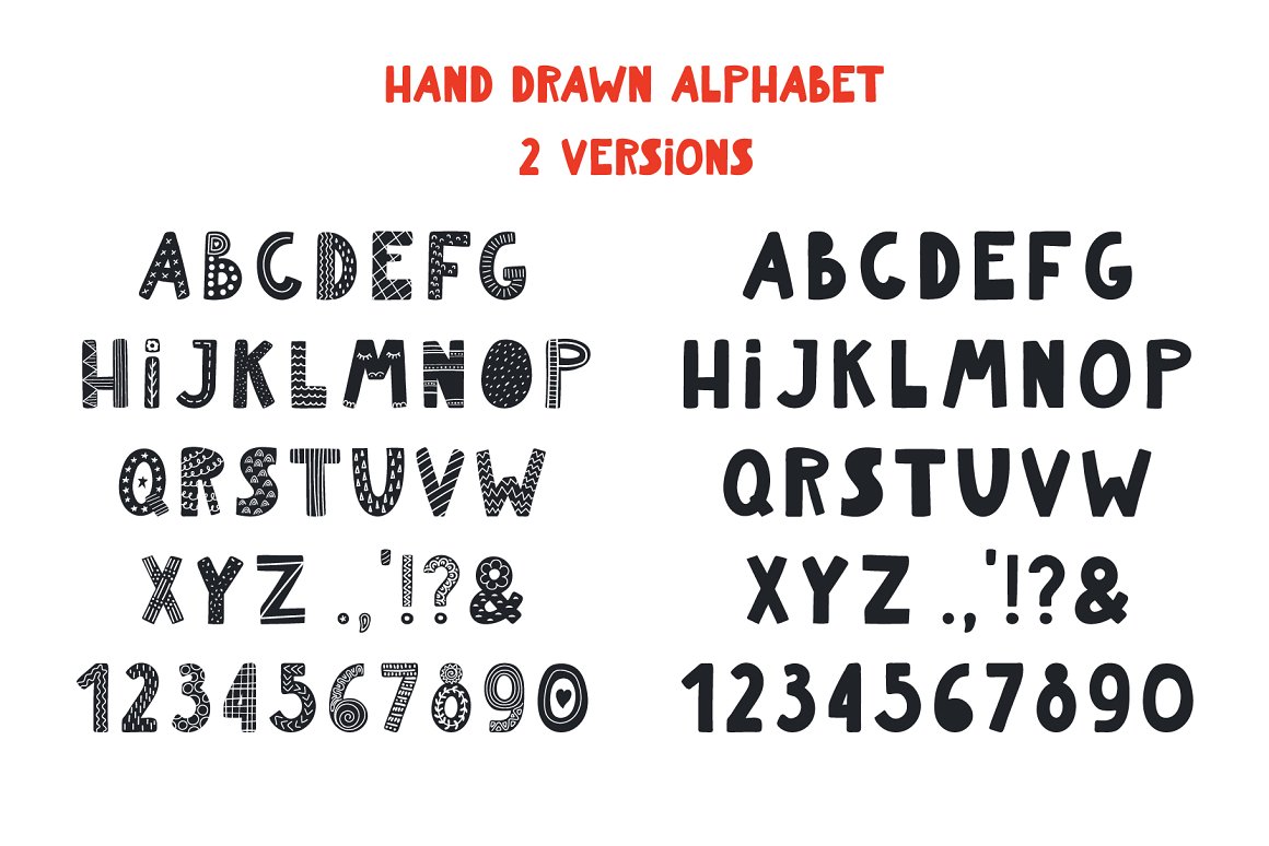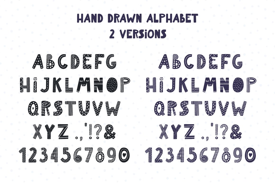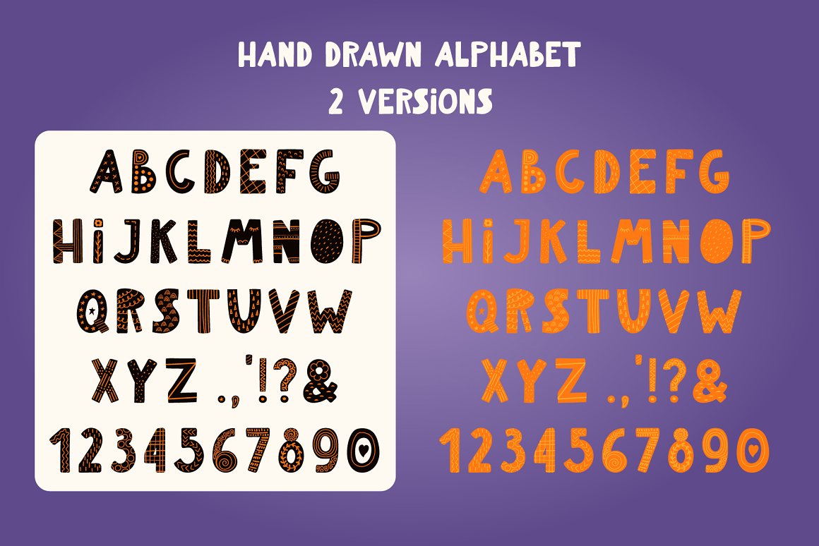 - 1 hand drawn alphabet in 5 versions (black, white, patterned black, patterned white, pastel multicolor) (AI, EPS10, separate high resolution PNG with transparent background)