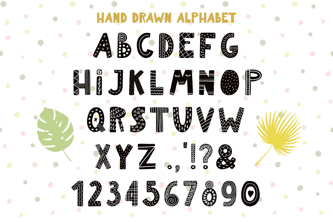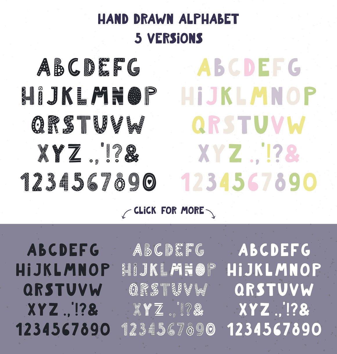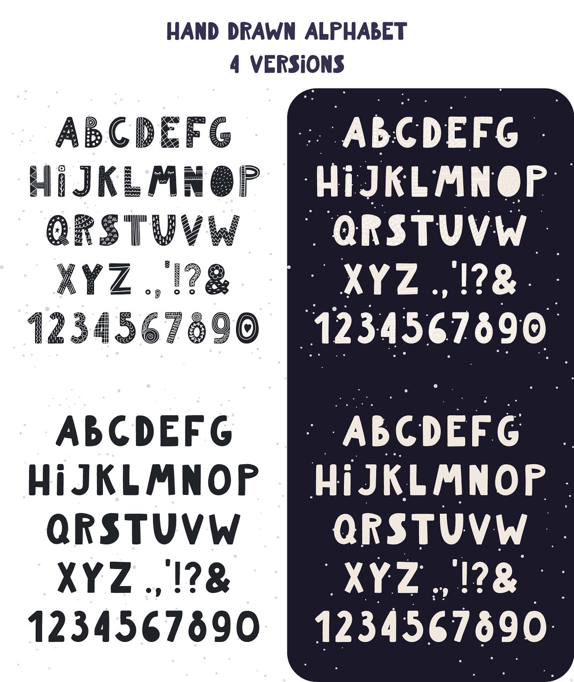 - 1 hand drawn alphabet in 5 versions (black, white, patterned black, patterned white, pastel multicolor) (AI, EPS10, separate high resolution PNG with transparent background)