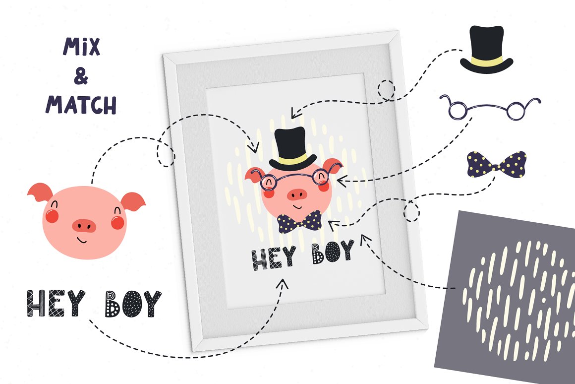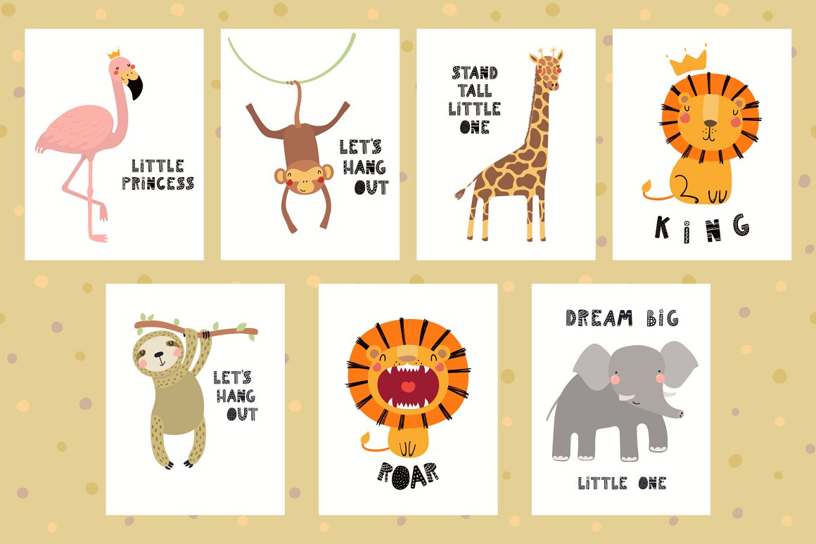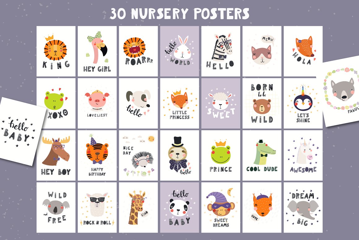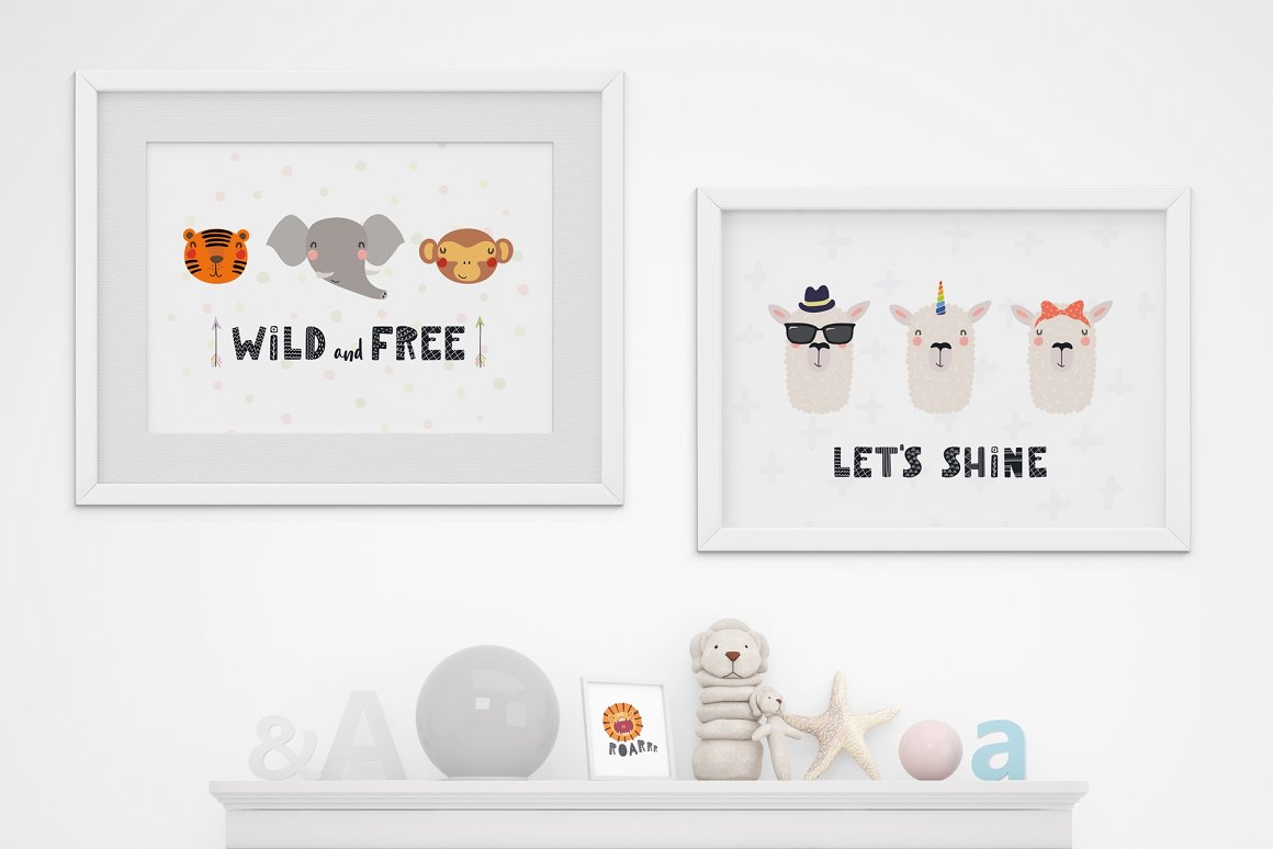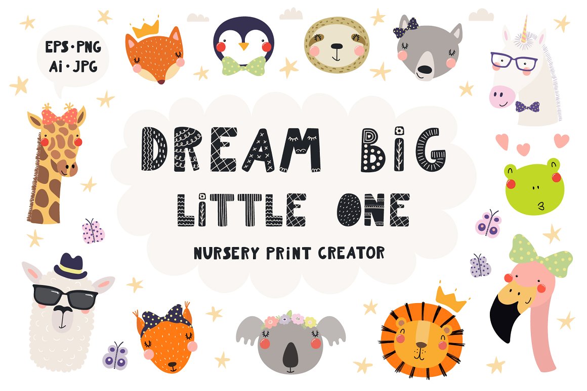 This cutest vector set with 26 little baby animals was inspired by Scandinavian design and Japanese kawaii aesthetic. Also included are cute accessories, clipart elements, hand drawn alphabet and lettering quotes. Create countless design projects for kids with my lovely collection! 162 unique graphic elements in total.