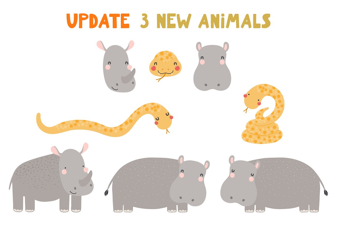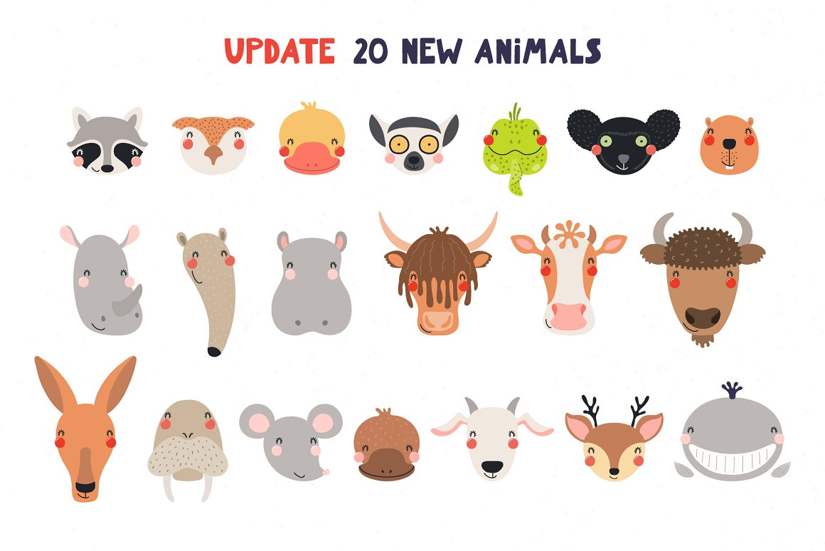 - 25 new cute animal illustrations: deer, cow, whale, walrus, goat, hippo, rhino, anteater, kangaroo, bison, yak, beaver, iguana lizard, owl, raccoon, lemur, indri, duck, platypus, mouse (AI, EPS10, separate high resolution PNG with transparent background)