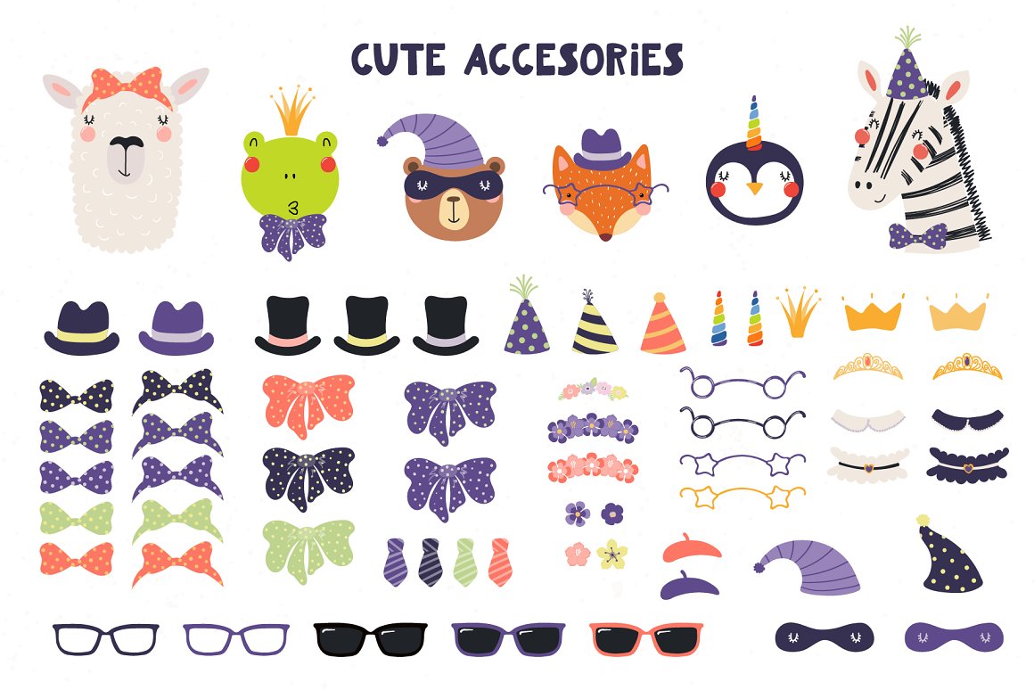 - 27 cute accessories, in different colors (AI, EPS10, separate high resolution PNG with transparent background)