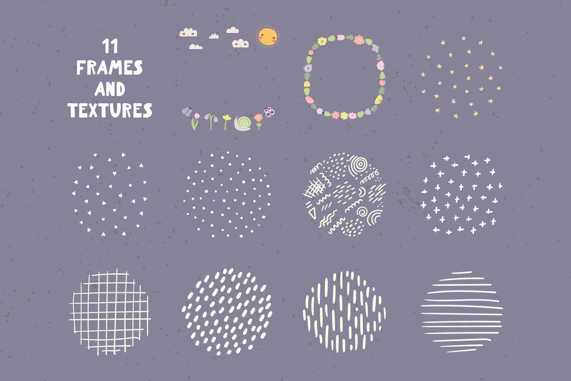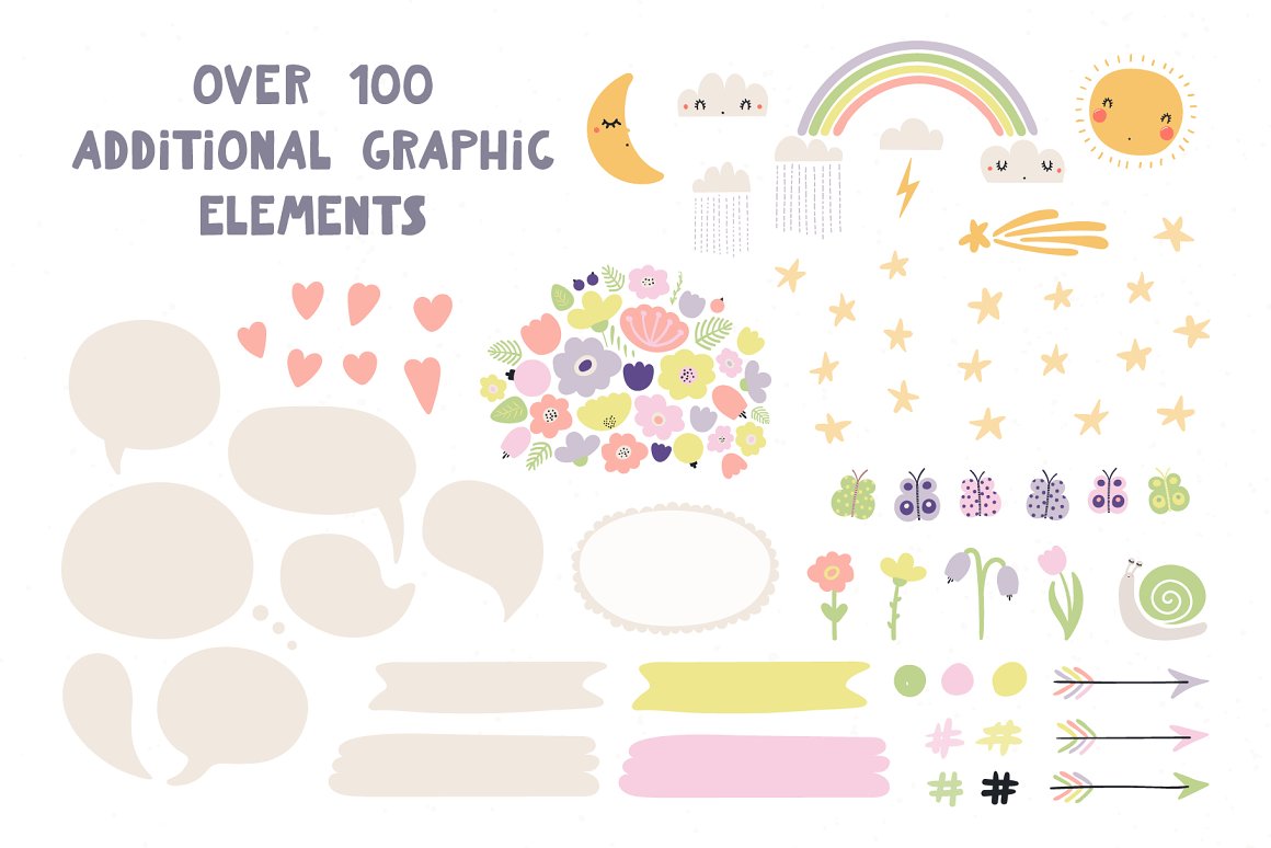 - 109 additional elements (speech bubbles, labels, hearts, sun, moon, stars, flowers, butterflies, etc.) (AI, EPS10, separate high resolution PNG with transparent background)