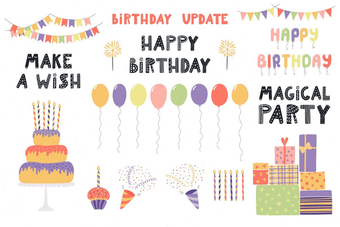 - 15 new elements of lovely clipart, including cakes, candy, love potion, letter, glasses, gifts, rainbow (AI, EPS10, separate high resolution PNG with transparent background)