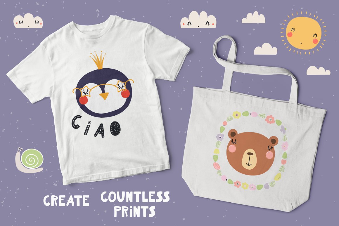 10 collections of adorable hand drawn characters, clipart, seamless patterns, alphabets, lettering quotes and pre-made designs. Create countless designs for nursery and apparel prints, kids products and decor, greeting cards, invites for baby showers, birthdays, Easter, Halloween, Christmas, Saint Valentine’s.