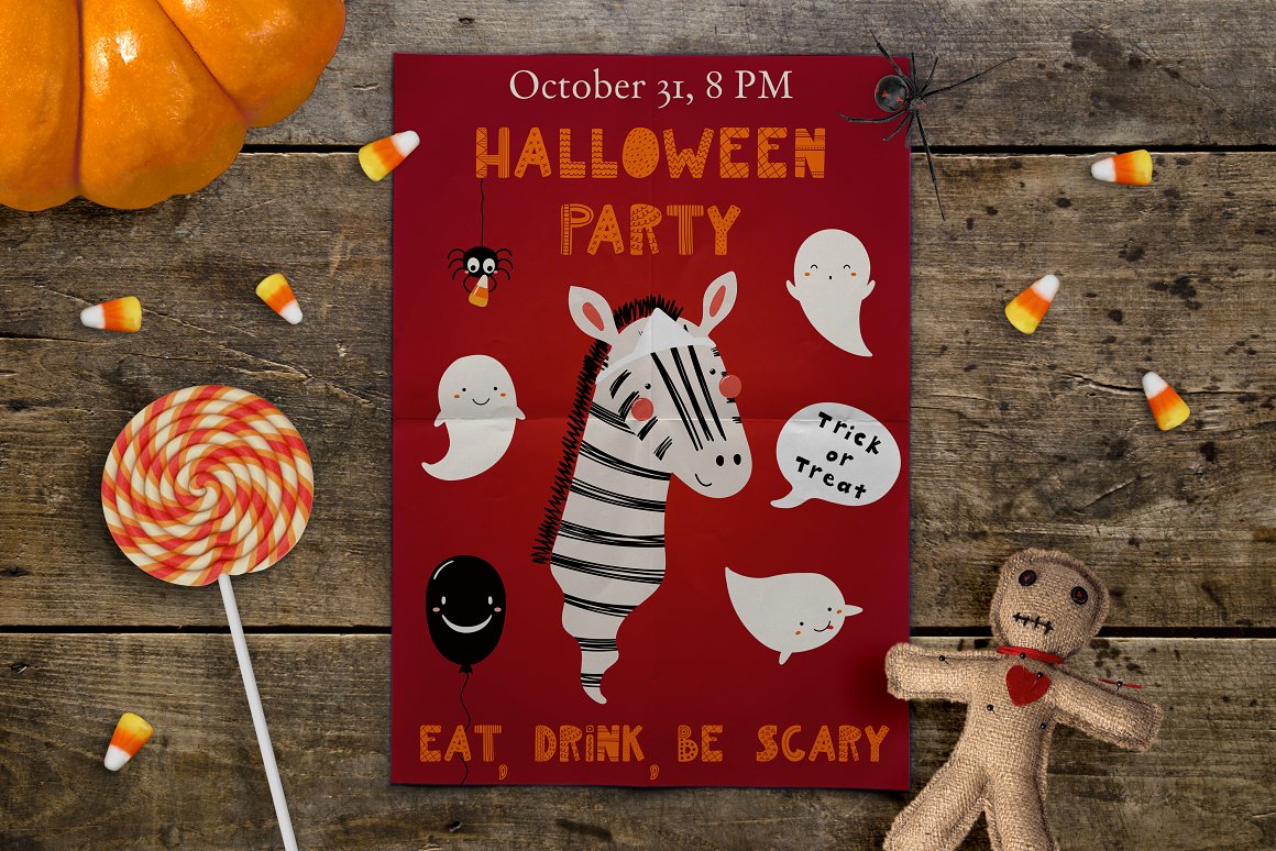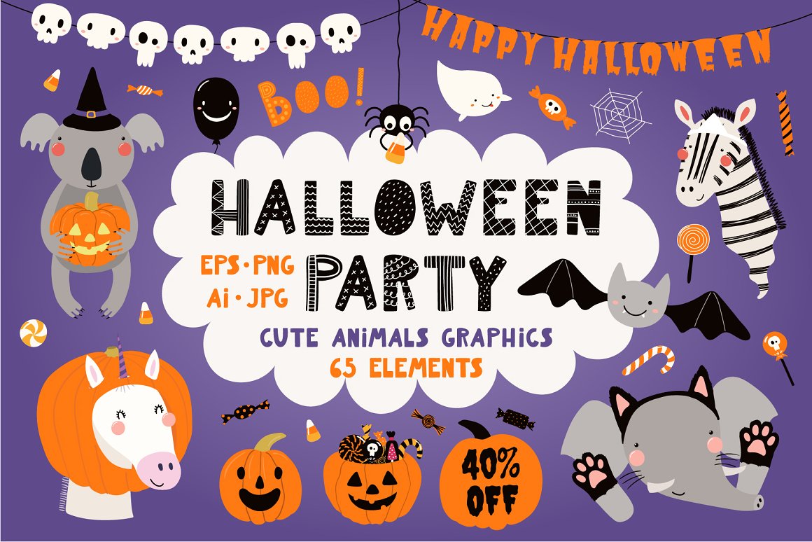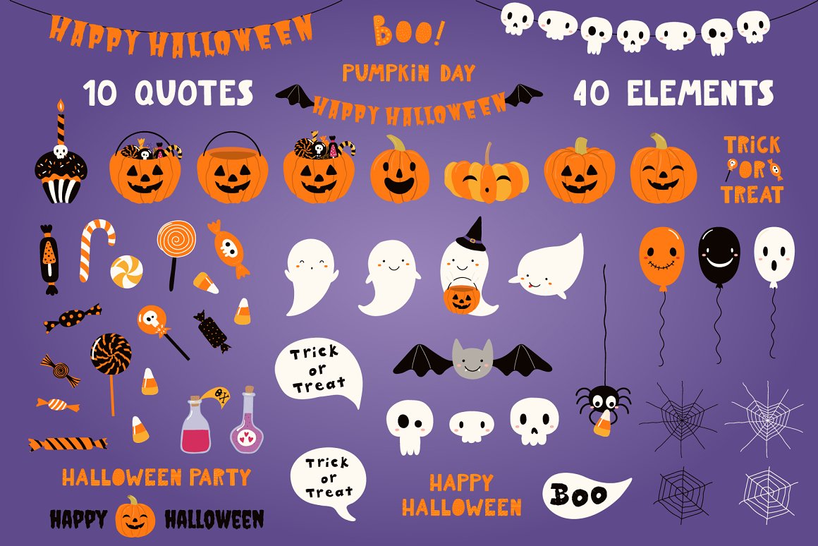 - 40 additional elements, including jack o lantern pumpkins, ghosts, candy, bat, spider webs, skulls, balloons, bunting (AI, EPS10, separate high resolution PNG with transparent background)